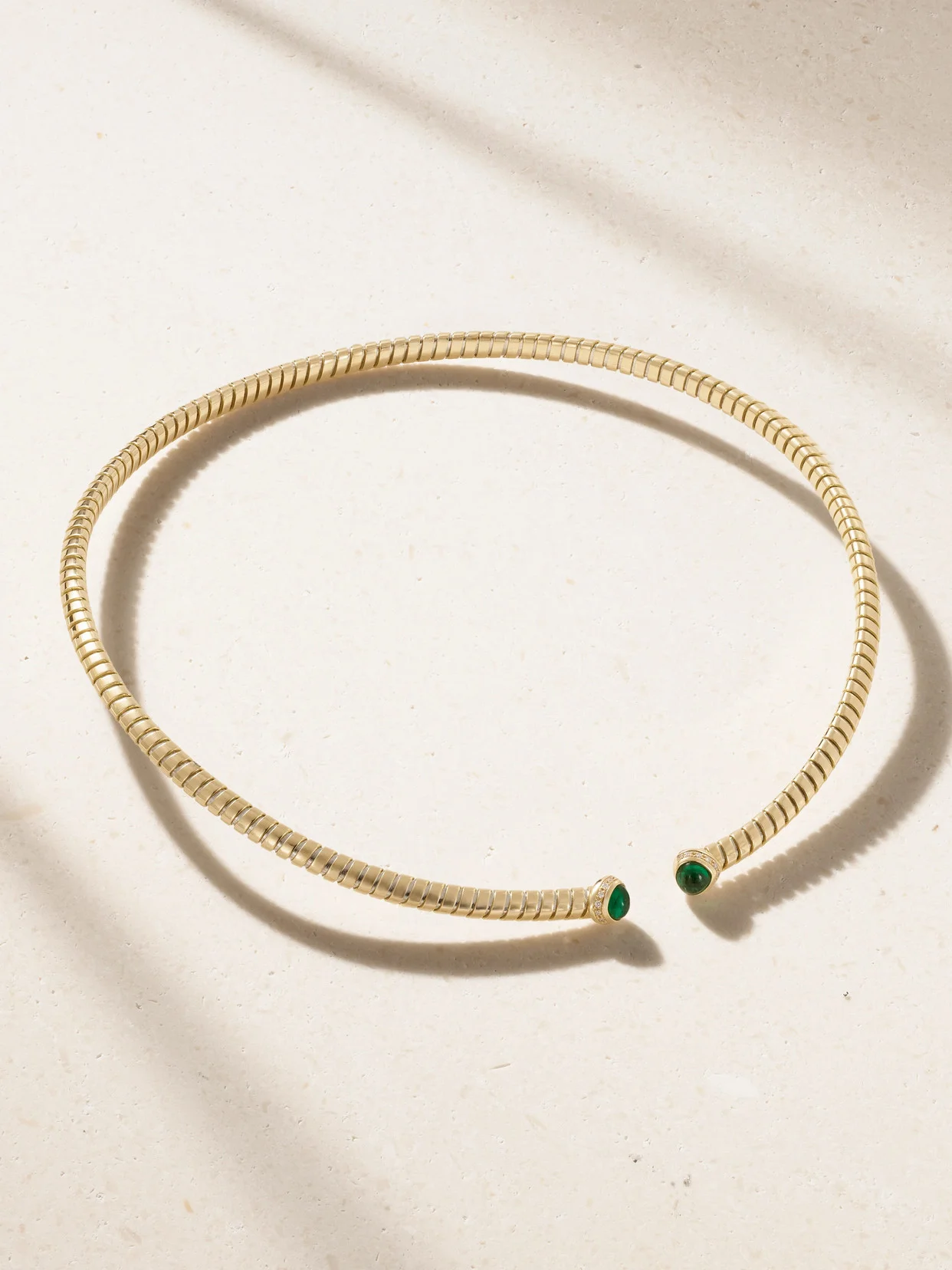 Sculptural and elegant, Marina B's choker is so striking. Crafted from polished 18-karat gold, the open collar is encrusted with light-reflecting cabochon emeralds and sparkling pave diamonds. Highlight the curved shape with round necklines.