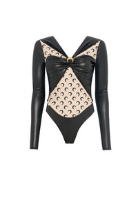Topstitched hem and cuffs with self-fabric bias Gold MARINE SERRE Moon brooch in the middle of the chest All Over Moon inner cut-outs Elastic rushed back Materials Black Jersey Drapped 100% polyester All Over Moon Jersey Tan Marine Serre’s Borderline groups all the essential layering pieces synonymous with the brand. Through a body-conscious approach, these accessible pieces sheathe the body in the shape of second skins or casual t-shirt archetypes. 88% Recycled Polyamide, 12% Recycled Elastane