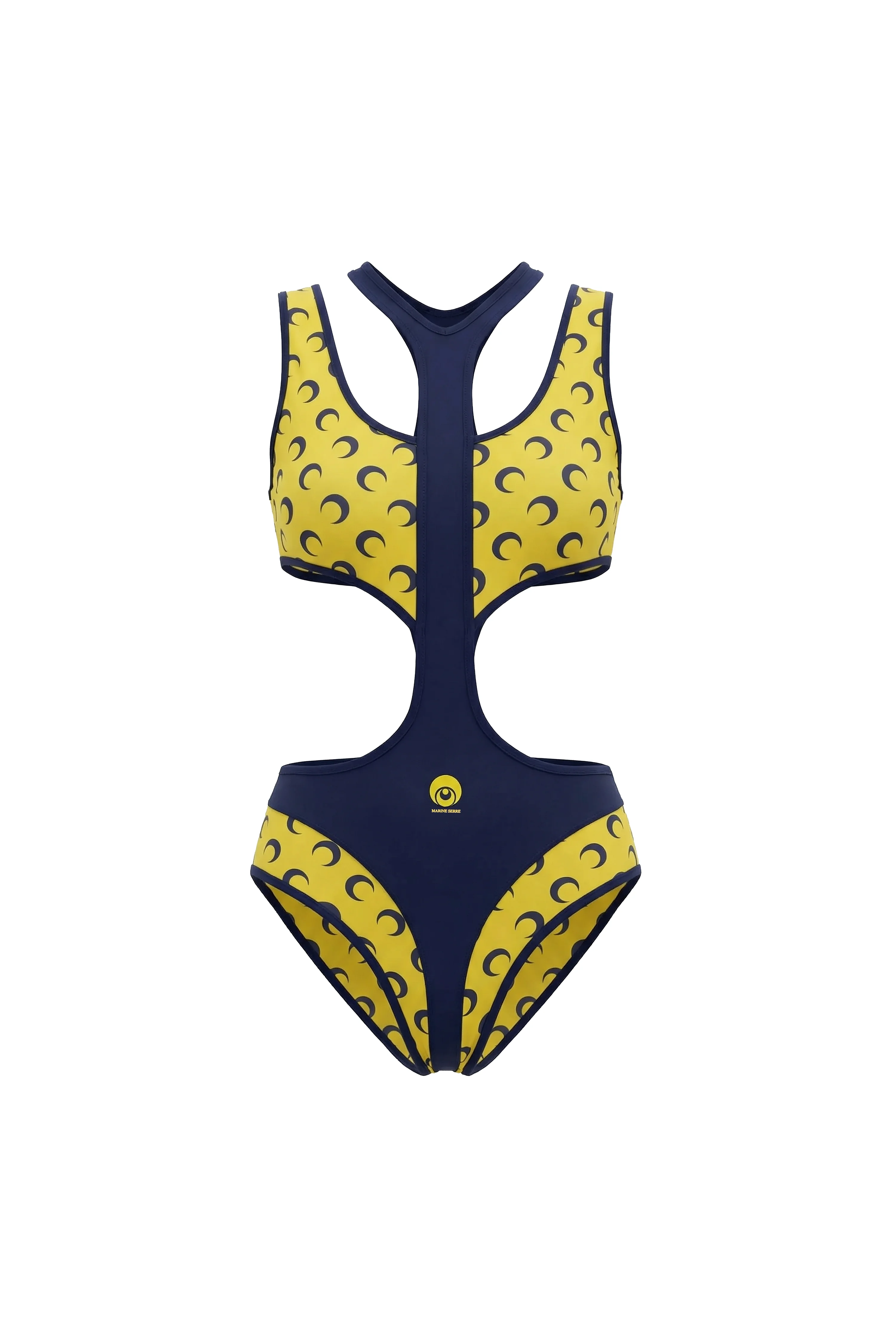 Fitted athleisure cut-out bodysuit with moon inserts Product Detail - Shoulder straps - Marine Serre athleisure printed logo Composition and Traceability Product details page relating to environmental qualities or characteristics WTO482A CJER0101 BL80 MIDNIGHT BLUE Composition: - Main Fabric: 65% Polyamide, 35% Elastane This product releases plastic microfibres into the environment during washing. Care Instructions: Very gentle machine wash at 30°C with similar garments (jersey) Do not bleach Iron at low temperature on the reverse side Moderate dry cleaning Do not tumble dry Traceability: - Weaving/Knitting: Italy - Dyeing: Italy - Manufacturing: Portugal