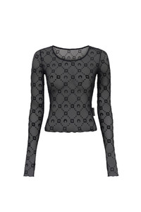 - Reinforced neckline - Moonogram flock allover - Babylock cuffs and hem - Label with logo on side seam Materials Moonogram Mesh Flock Black The Moonogram motif is flocked with soft velvet on our recycled mesh jersey, creating an incredibly comfortable fabric. The mesh’s transparency calls back to Marine Serre’s transgressive vision by having a material traditionally used solely for lingerie reimagined as day-to-day wear 86% Polyamide - Recycled (GRS Certified), 14% Elastane