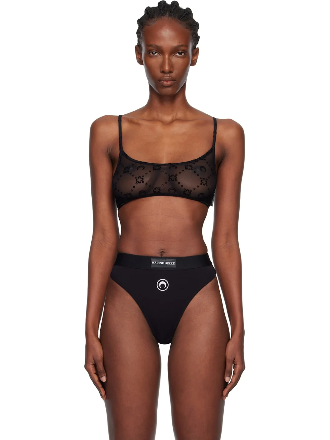 Sheer stretch recycled nylon mesh bralette. · Logo pattern flocked throughout · Scoop neck · Adjustable spaghetti straps · Logo flag at side seam Supplier color: Black 86% recycled polyamide, 14% elastane. Made in Italy 252020F073000