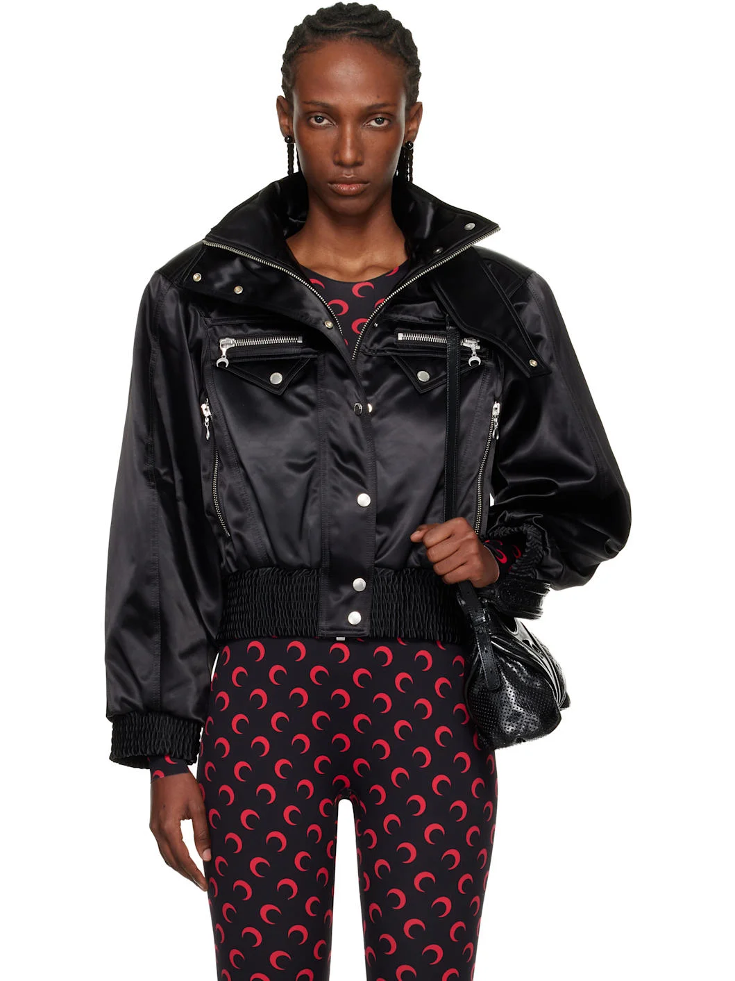 Satin bomber jacket. · GRS-certified nylon · Funnel neck with detachable press-stud strap · Two-way zip closure with press-stud placket · Zip and flap pockets at chest · Zip pockets at waist · Partially-elasticized hem · Padded shoulders · Ruching at sleeves · Elasticized cuffs · Pleats and leather logo patch at back · Full logo-woven satin lining · Logo-engraved silver-tone hardware Supplier color: Black Body: 40% polyester, 30% recycled polyamide, 22% polyamide, 8% polyurethane. Lining: 100% viscose. Made in Italy 252020F058001