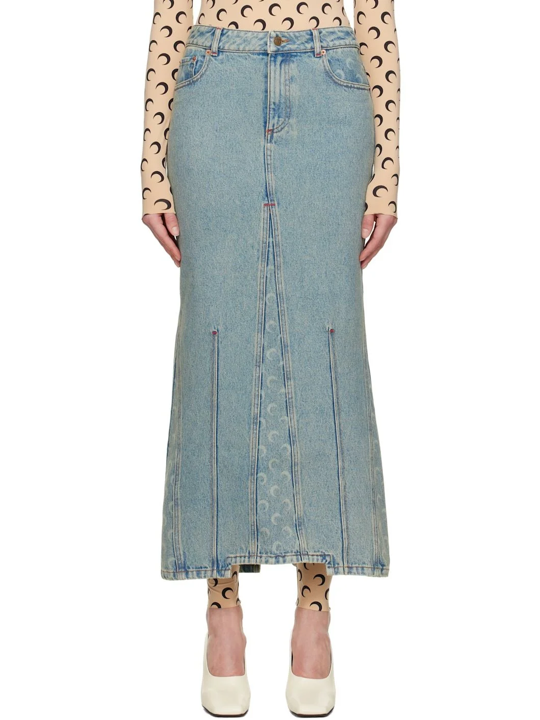 Non-stretch GOTS-certified organic cotton denim maxi skirt. Laser-printed logo pattern and fading throughout. · Paneled construction · Belt loops · Five-pocket styling · Zip-fly · Darts at hem · Jacron logo patch at back waistband · Central vent at back hem · Logo-engraved antiqued gold- and copper-tone hardware · Contrast stitching in tan Supplier color: Light beige 100% cotton. Made in Italy 251020F093000