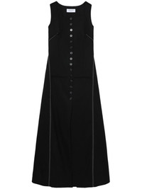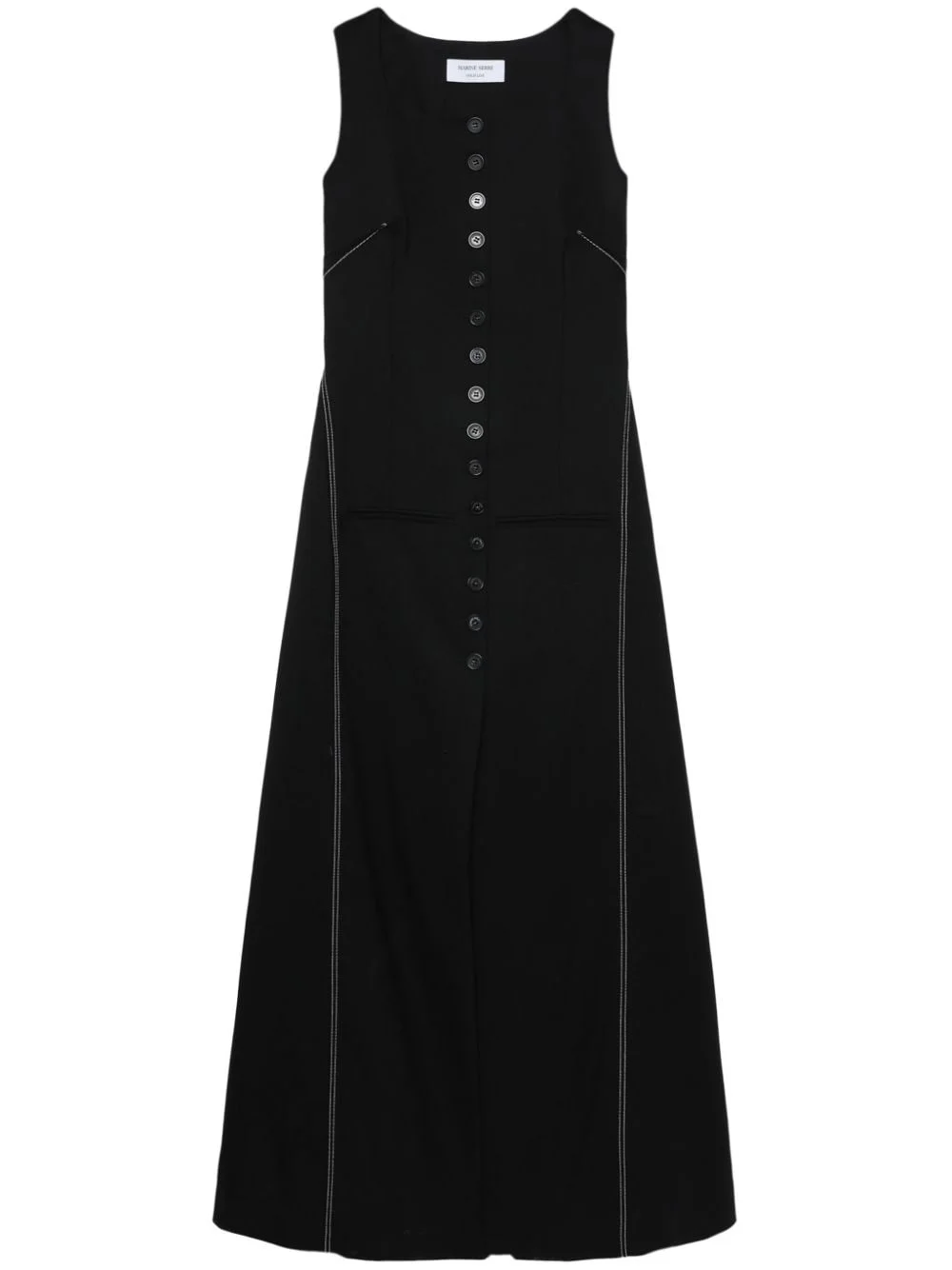 button-down flared midi dress Rendered in black, this elegant dress from Marine Serre features a square neck and a button placket that resembles a corset silhouette around the bust. It's finished with contrasting stitching and a slitted, flared skirt for a playful flair. Highlights - Black - Virgin wool blend - Contrast stitching - Logo tag - Square neck - Sleeveless - Front button placket - Flared skirt - Front slit - Rear slit Imported Composition Virgin Wool 98%, Elastane 2% Washing instructions Read Manufacturer Guidelines