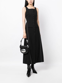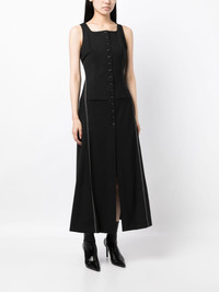 button-front wool midi dress Marine Serre presents this midi dress, expertly crafted from stretch-wool to provide a comfortable yet refined fit. The square neck and sleeveless design are complemented by front button fastening and contrast stitching, while the front and rear slits lend an ease of movement to the calf-length silhouette. Highlights - Black - Stretch-wool - Square neck - Sleeveless - Front button fastening - Contrast stitching - Front slit - Rear slit - Calf-length Imported Composition Body: Wool 98%, Elastane 2% Lining: Viscose 100% SIZE & FIT Model measurements Height 5 ft 10 in(1.77 m) Bust/Chest 28.74 in(73 cm) Hips 35.82 in(91 cm) Waist 24.4 in(62 cm) FittingInformation Designed for a slim fit that sits just away from the body offering a close yet comfortable fit Made from a midweight stretch fabric, this piece offers elasticity and flexibility when worn This piece fits true to size – take your usual size Washing instructions Dry Clean Only