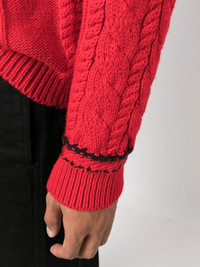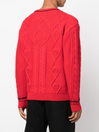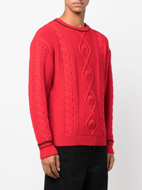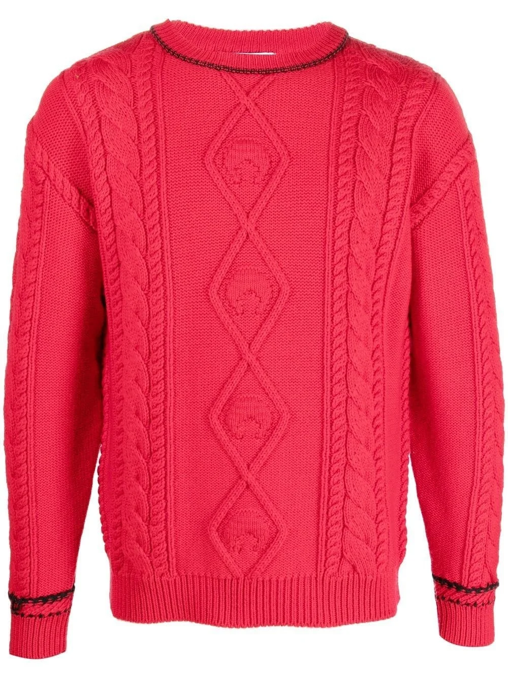 cable-knit wool jumper Woven in a bright red wool construction, this jumper by Marine Serre features branded motifs such as the crescent moon sculpted symmetrically through a cable-knit technique. Highlights - Red - Wool - Cable knit - Contrast stitching - Long sleeves - Round neck - Straight hem - When buying this unisex item, keep in mind that it is graded in standard men's sizing. Imported Composition Wool 100% SIZE & FIT Model measurements Height 5 ft 10 in(1.78 m) Bust/Chest 33.07 in(84 cm) Hips 35.82 in(91 cm) Waist 25.98 in(66 cm) FittingInformation This piece is unisex. Please take care when selecting your size Cut for a relaxed fit for both men and women Made with a mid-weight fabric Washing instructions Hand Wash