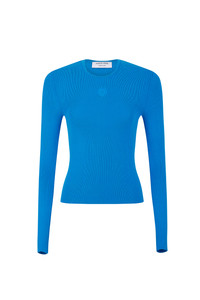 Moon logo embroidery in blue below front collar Ribbing along neckline and body hem Materials Blue Knit Essential in wardrobes, classic knitwear techniques and typologies inspire Marine Serre to create its own garments for everyday wear. Experimenting with end-of-line yarns or picking out cruelty-free wool yarns from non-mulesed animals, the choice of materials is carefully meditated to provide a comfortable, high-quality finish with a conscious approach. 98% Viscose, 2% Elastane