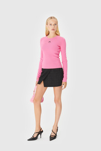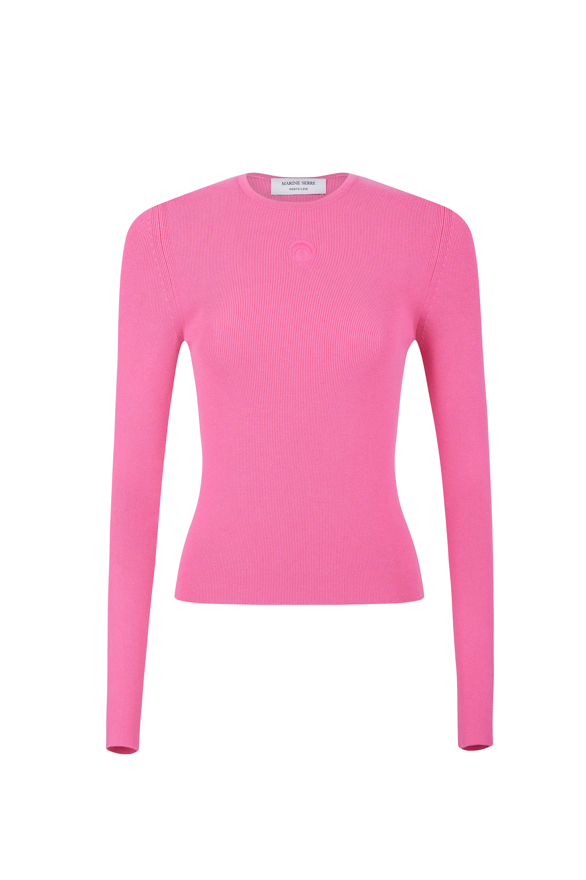 Moon logo embroidery in pink tone below front collar Ribbing along neckline Materials Pink Knit Essential in wardrobes, classic knitwear techniques and typologies inspire Marine Serre to create its own garments for everyday wear. Experimenting with end-of-line yarns or picking out cruelty-free wool yarns from non-mulesed animals, the choice of materials is carefully meditated to provide a comfortable, high-quality finish with a conscious approach. 98% Viscose, 2% Elastane