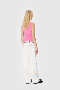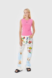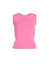 Moon logo embroidery in pink tone below front collar Ribbing along neckline and armhole Materials Pink Knit Essential in wardrobes, classic knitwear techniques and typologies inspire Marine Serre to create its own garments for everyday wear. Experimenting with end-of-line yarns or picking out cruelty-free wool yarns from non-mulesed animals, the choice of materials is carefully meditated to provide a comfortable, high-quality finish with a conscious approach. 98% Viscose, 2% Elastane