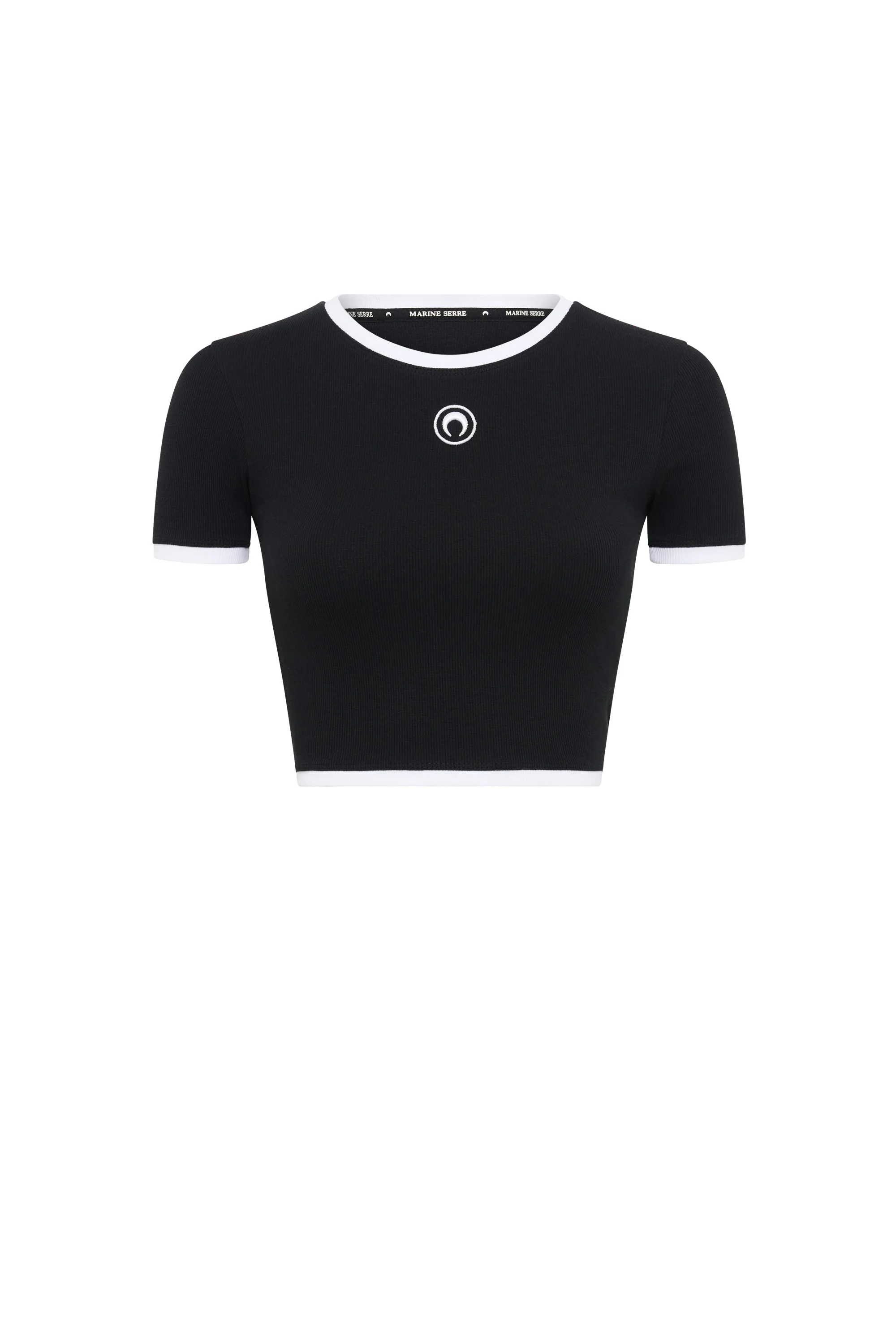 - Ribbed neckline and cuffs - Contrasted finishings - Embroidered logo under neck in front - Woven label with logo under neck in back Materials Black Organic Cotton All of the cotton that Marine Serre sources for the BORDERLINE collection is certified GOTS (Global Organic Textile Standard). This certification is the worldwide leading textile processing standard for organic fibers and provides credible assurance of responsible manufacturing with the least chemical inputs. In terms of shapes, the House proposes a wide range of everyday styles taken directly from the sportswear universe. 95% Organic Cotton, 5% Elastane