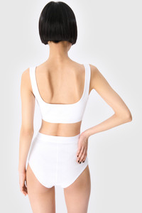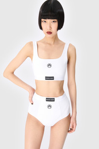 - Stretch fabric - Elastic chestband - Moon logo embroidered on chest - Branded label woven on chestband in front Materials White Organic Cotton All of the cotton that Marine Serre sources for the BORDERLINE collection is certified GOTS (Global Organic Textile Standard). This certification is the worldwide leading textile processing standard for organic fibers and provides credible assurance of responsible manufacturing with the least chemical inputs. In terms of shapes, the House proposes a wide range of everyday styles taken directly from the sportswear universe. 100% Cotton (GOTS Certified)
