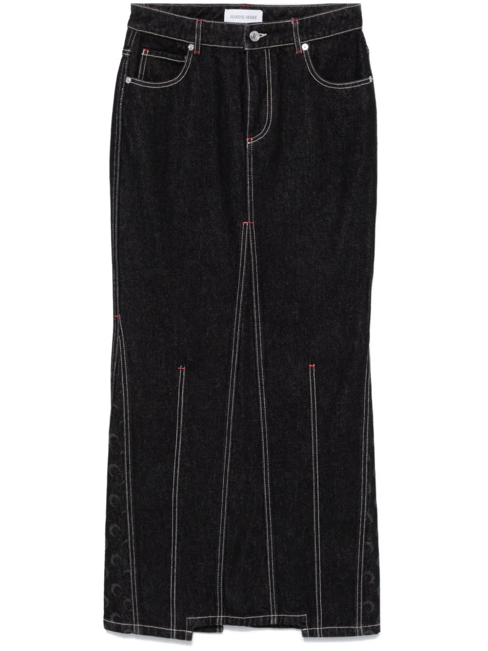Crescent-Moon maxi skirt Highlights - Black - Organic cotton - Denim - Panelled design - Crescent moon print - Front button and zip fastening - Belt loops - Contrast stitching - Classic five pockets - Logo patch to the rear - Crescent moon embroidery - Rear slit - Asymmetric hem - Long length Made In Italy Composition Lining: Organic Cotton 100% Outer: Organic Cotton 100%