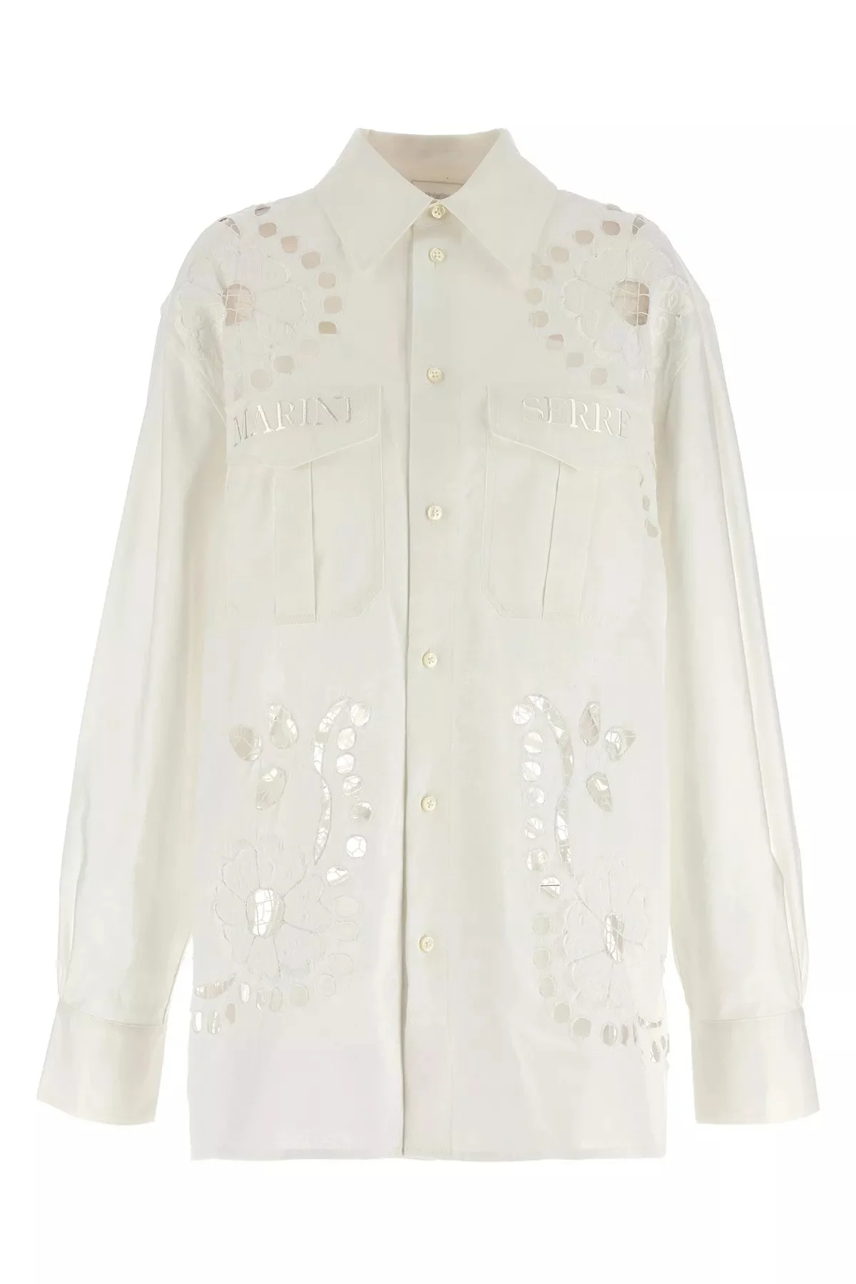 cod. USI022AUWOV0045WH20 Cotton shirt with embroidery and cut-out details, front button closure, pockets, long cuffed sleeves. SUSTAINABLE: Product made with regenerated materials. Color: White Size & Fit: Boxy fit Composition: 100% cotton Made in: Romania