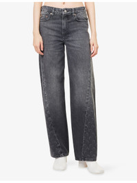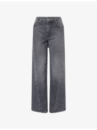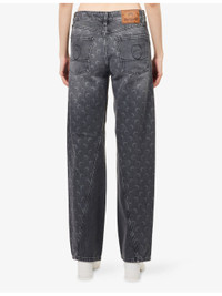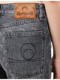 PRODUCT DETAILS - Marine Serre denim jeans - 100% cotton - Exposed button and concealed zip-fly fastening at front - Baggy fit, high-rise, wide leg, belt loops, five pockets, twisted seam at front, brand patch at back, moon print at back and sides, faded wash - Machine wash cold - Made in Turkey - True to size - Size UK 8: rise 11in / 29cm, inside leg 32in / 81cm, leg opening 18in / 46cm - Model is 5ft 10in/1.78m and wears a size UK 8 - Midweight, slight stretch Ref: R04496591