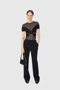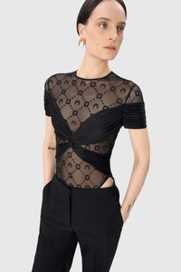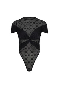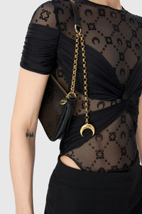 - Jersey draping over signature Moonogram mesh flock - Invisible zip on the side - Snap-button closing system at the crotch - Turned hem Materials Draped Jersey In many ways, elevating conventional fabrics such as activewear jersey through precise couture techniques has served as the blueprint for Marine Serre’s transgressive vision of womenswear at large. This unabashedly glamorous, all-female range reimagines traditional sportswear styles through draping, pleating and a trompe l’oeil play on transparency. Garments emphasize the bust and hips, with a prominent use of cut-outs, complimented by our seductive Moonogram Mesh Jersey (made from GRS-certified recycled fibres). All are designed with full ease of movement in mind — even traditional evening silhouettes. To this end the draped jersey is smooth and soft, with a natural sheen. 65% Polyamide, 35% Elastane