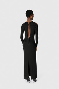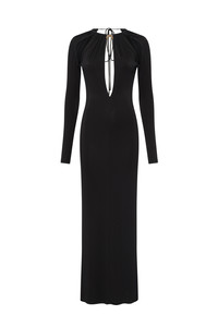 Fitted ankle length long dress with crewneck and long sleeves Product Detail - Plunge neckline - Tied with a drawstring - Raglan sleeves - Moon charm - Cutout sleeves Composition and Traceability Product details page relating to environmental qualities or characteristics WDR410A CJER0082 BK99 BLACK Composition: Main Fabric: 95% Viscose - 5% Elastane Traceability: Weaving/Dyeing: Italy Manufacturing: France