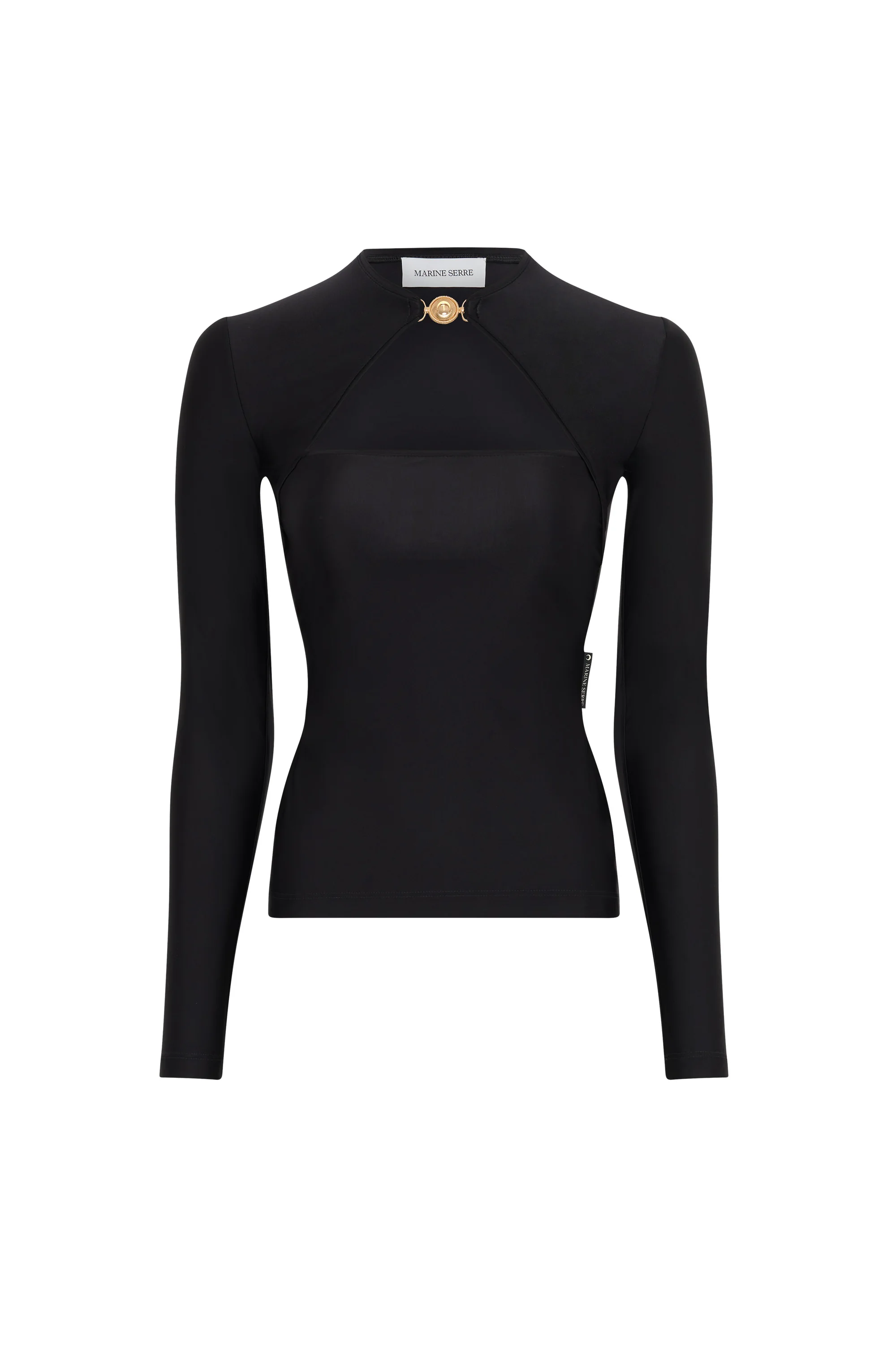 - Moon jewelry clip closure at front neck - Extra long sleeves with thumbholes - Turned hem Materials Draped Jersey In many ways, elevating conventional fabrics such as activewear jersey through precise couture techniques has served as the blueprint for Marine Serre’s transgressive vision of womenswear at large. This unabashedly glamorous, all-female range reimagines traditional sportswear styles through draping, pleating and a trompe l’oeil play on transparency. Garments emphasize the bust and hips, with a prominent use of cut-outs, complimented by our seductive Moonogram Mesh Jersey (made from GRS-certified recycled fibres). All are designed with full ease of movement in mind — even traditional evening silhouettes. To this end the draped jersey is smooth and soft, with a natural sheen. 65% Polyamide, 35% Elastane