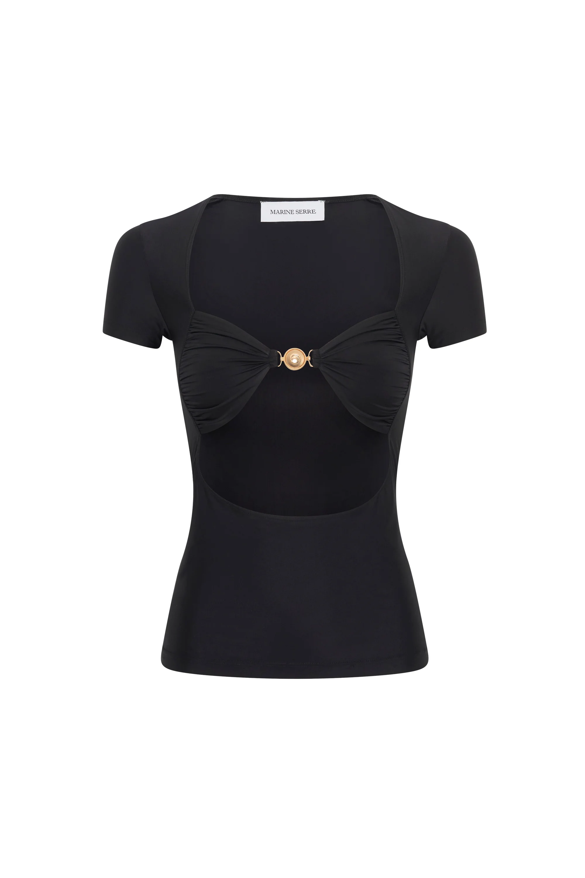 - Self fabric bralette with Moon jewelry clip closure - Turned hem Materials Draped Jersey In many ways, elevating conventional fabrics such as activewear jersey through precise couture techniques has served as the blueprint for Marine Serre’s transgressive vision of womenswear at large. This unabashedly glamorous, all-female range reimagines traditional sportswear styles through draping, pleating and a trompe l’oeil play on transparency. Garments emphasize the bust and hips, with a prominent use of cut-outs, complimented by our seductive Moonogram Mesh Jersey (made from GRS-certified recycled fibres). All are designed with full ease of movement in mind — even traditional evening silhouettes. To this end the draped jersey is smooth and soft, with a natural sheen. 65% Polyamide, 35% Elastane
