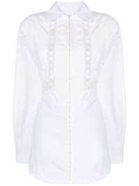 Household linen lace-trim shirtdress Marine Serre stays true to its eco-conscious approach and DIY-inspired aesthetic with this shirtdress. Crafted from repurposed cotton pillowcases, it’s assembled to spotlight the original lace trims and features an adjustable lace-up fastening at the back. Highlights - White - Cotton - Lace trim - Straight-point collar - Front hook and eye fastening - Rear lace-up fastening - Long sleeves - Buttoned cuffs - Curved hem Imported Composition Outer: Cotton 100%, Viscose 97%, Elastane 3% SIZE & FIT Model measurements Height 5 ft 10 in(1.79 m) Bust/Chest 31.1 in(79 cm) Hips 35.03 in(89 cm) Waist 24.01 in(61 cm) FittingInformation Designed for a slim fit that sits just away from the body offering a close yet comfortable fit The adjustable tie waist gives a more adaptable and personalised fit Made from a midweight non-stretch fabric This piece fits true to size – take your usual size Washing instructions Hand Wash