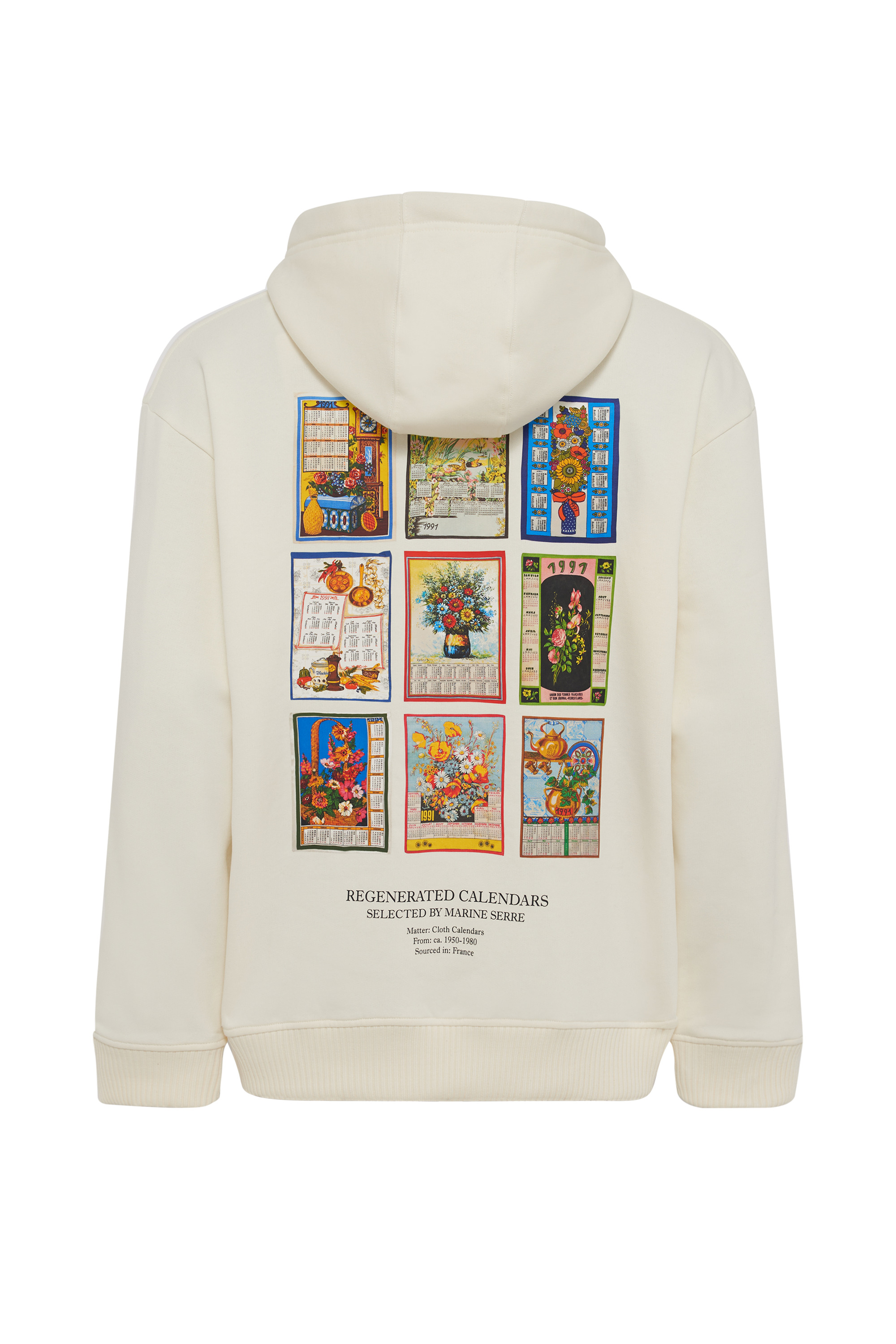 - Ribbed hem and cuffs - Flat cotton cord with frayed ends in off-white - Regenerated MARINE SERRE calendars print on the back - Contrasted black embroidered circle Moon logo in center below front collar Materials White Organic Cotton All of the cotton that Marine Serre sources for the BORDERLINE collection is certified GOTS (Global Organic Textile Standard). This certification is the worldwide leading textile processing standard for organic fibers and provides credible assurance of responsible manufacturing with the least chemical inputs. In terms of shapes, the House proposes a wide range of everyday styles taken directly from the sportswear universe. 100% Cotton (GOTS Certified)