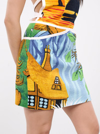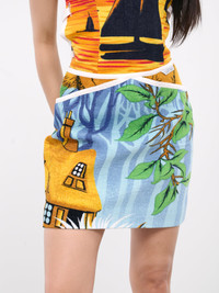 MARINE SERRE skirt in multicolor, paneled jersey towel construction, jacquard knit pattern, all-over graphic print, mid-rise, fitted waist, back concealed zip closure, front logo flag, satin piping, front pockets, straight hem, mini-length, slim fit. Made in France Main: 50% Cotton 50% Polyester Contrast: 100% Viscose Standard Sizing Model is 5'8" wearing size S. Bust: 32" Waist: 26" Hips: 34.5"