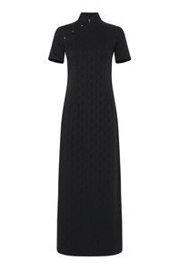 Mandarin collar 3 Moon buttons collar closure Black Piping on hems and collar Fully lined in light satin Back inserted with All Over Moon recycled jersey in tan shade Invisible zip closure on left side seam Materials Moon Diamant Jacquard Stretch 64% Acetate, 35% Viscose, 1% Elastane All Over Moon Tan on Black Jersey Second skin regenerated fabric, made from recycled jersey (GRS certified) are always presented in the Marine Serre collections. 78% Recycled Polyamide 22% Elastane