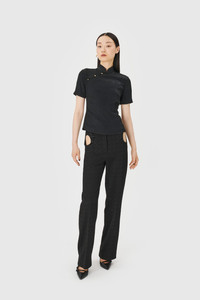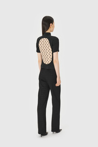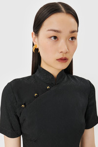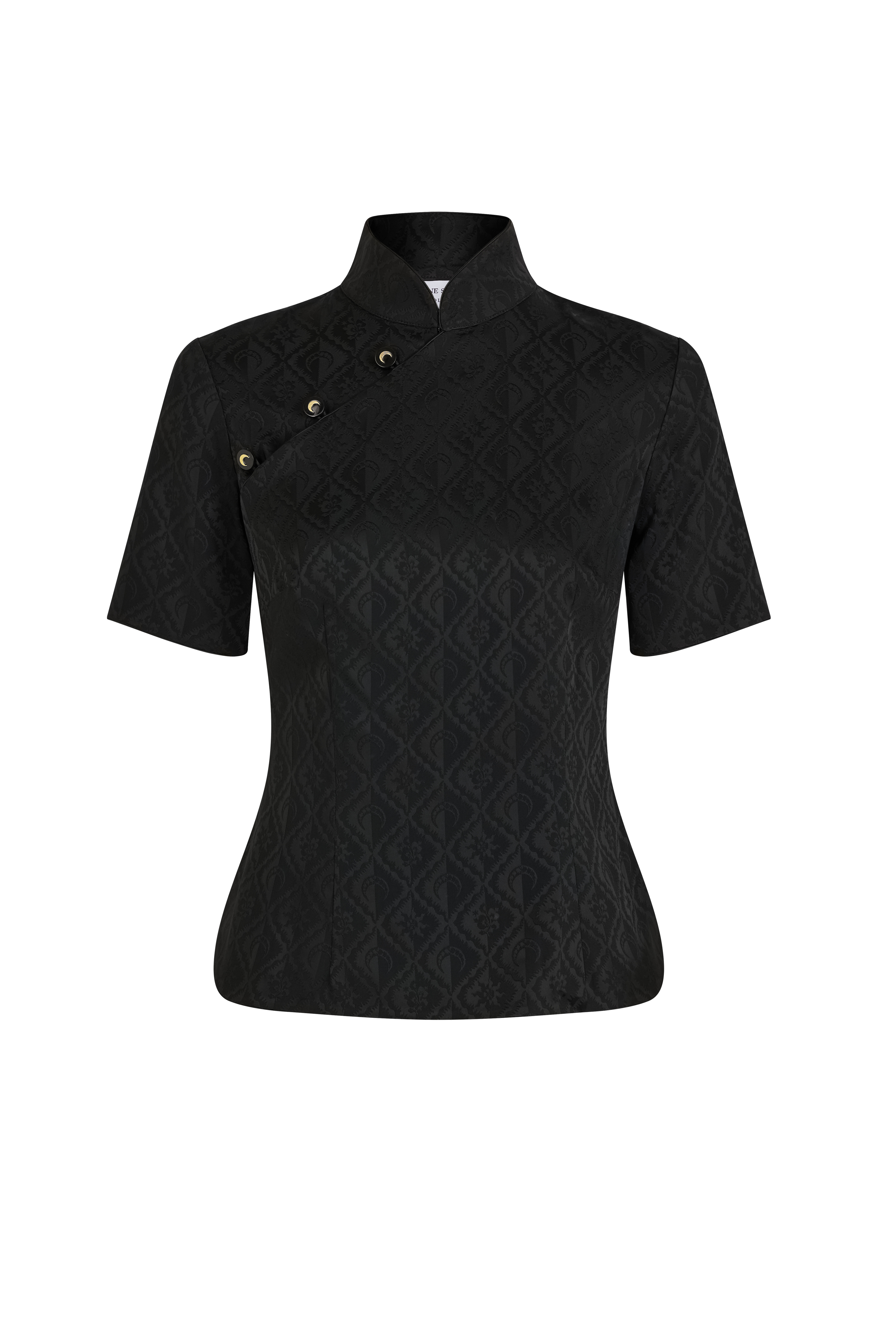 Mandarin collar 3 Moon buttons collar closure Black Piping on hems and collar Fully lined in light satin Back inserted with All Over Moon recycled jersey in tan shade Invisible zip closure on left side seam Materials Moon Diamant Jacquard Stretch 64% Acetate, 35% Viscose, 1% Elastane