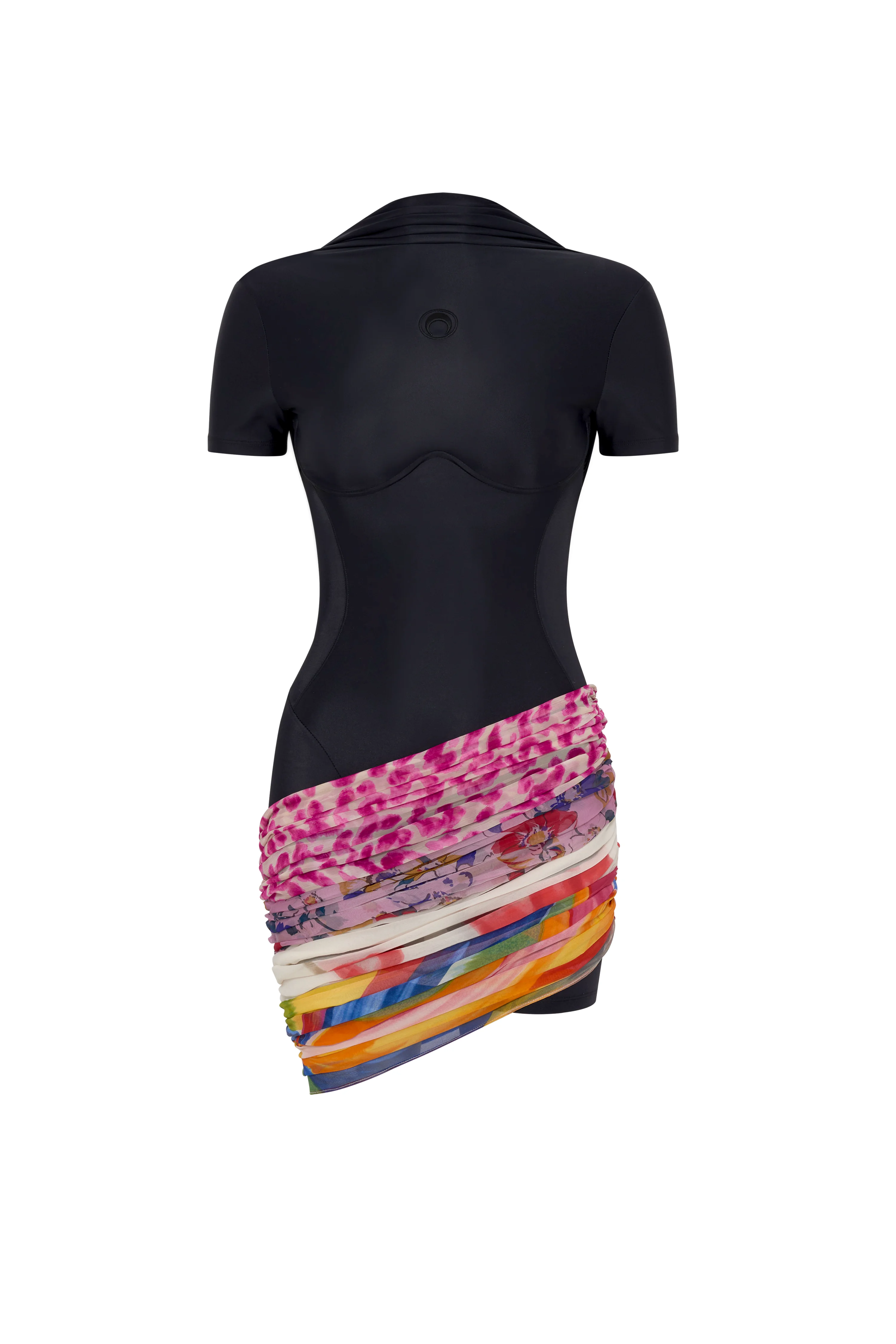 Jersey Mini Dress Product Detail - Round neck - Invisible zip on the left side - Marine Serre metal plate - Gathered silk scarves from the waist Composition and Traceability Product details page relating to environmental qualities or characteristics WDR457A_CJER0022_BK99_BLACK Composition : 98% Viscose, 8% Elastane Second fabric: 100% Silk Lining: 78% Polyamide, 22% Elastane Traceability: Weaving/Dyeing/Manufacturing: France