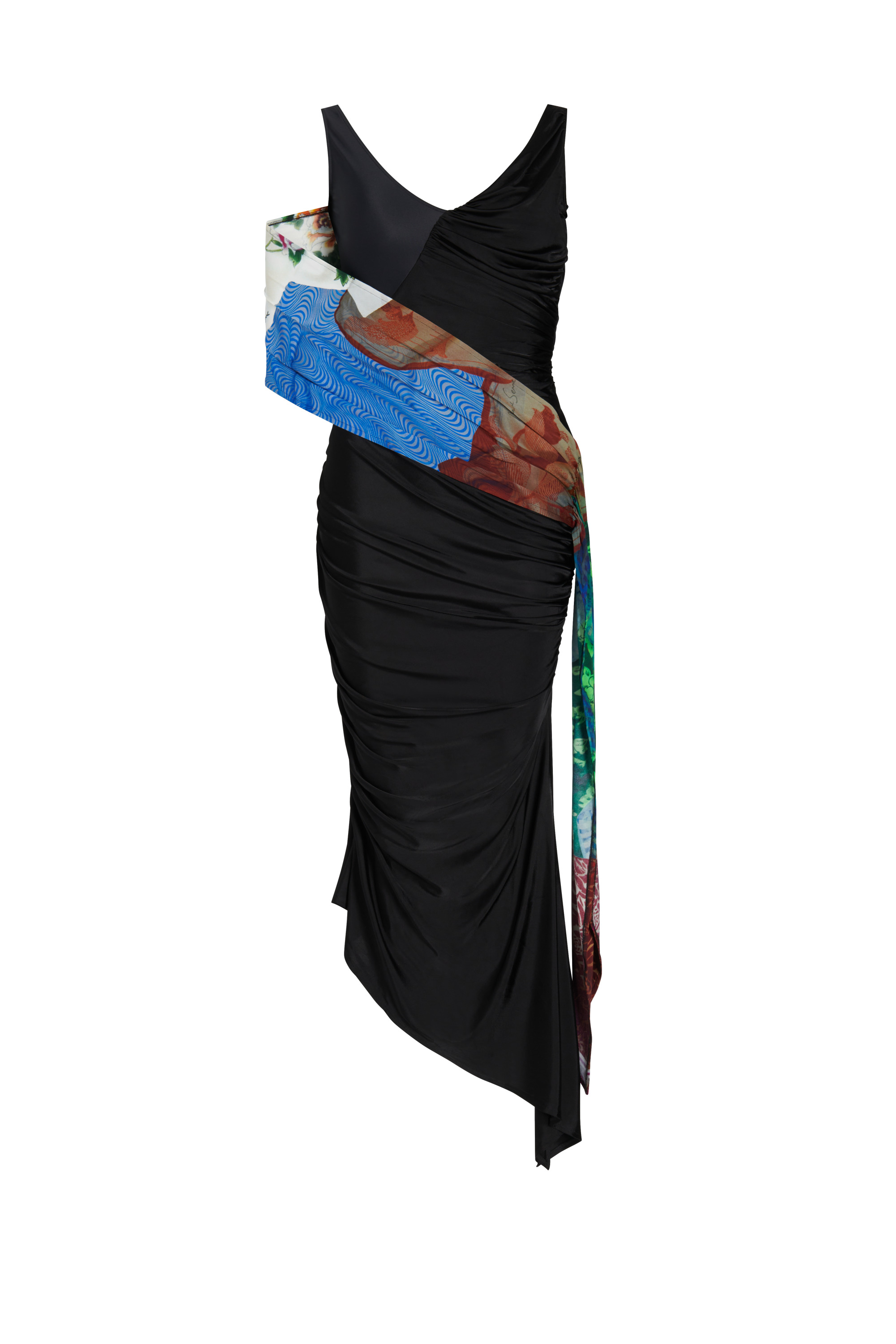 This draped dress features a double layer and a built-in body. It showcases an asymmetric scarf detail draped over the shoulder, adding an elegant touch to the design. Materials Shiny Black Jersey The Black Jersey continues to blend fashion and artistry. Crafted with premium jersey fabric, it maintains the perfect balance between comfort and style. It adds an elegant touch, making it versatile for a range of variations. Elevate your wardrobe with this exclusive material from Marine Serre, available in both multicolor, black and green versions. 95% Viscose, 5% Elastane