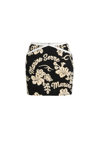 Invisible zip closure at back 2 front pockets Satin bias piping finishing at waistband, around pockets and at the back Seasonal Hawaian print Materials Hawai Jacquard towel 50% Cotton, 50% Polyester