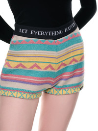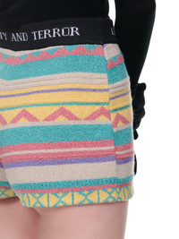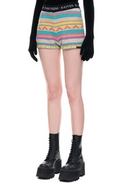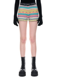 MARINE SERRE shorts in multicolor, up-cycled sweater, high-waist, elastic jacquard belt, branded label, mini length, fitted. Made in Italy Standard Sizing 100% Wool Model is 5'9" wearing size S. Bust: 33" Waist: 24" Hip: 33"