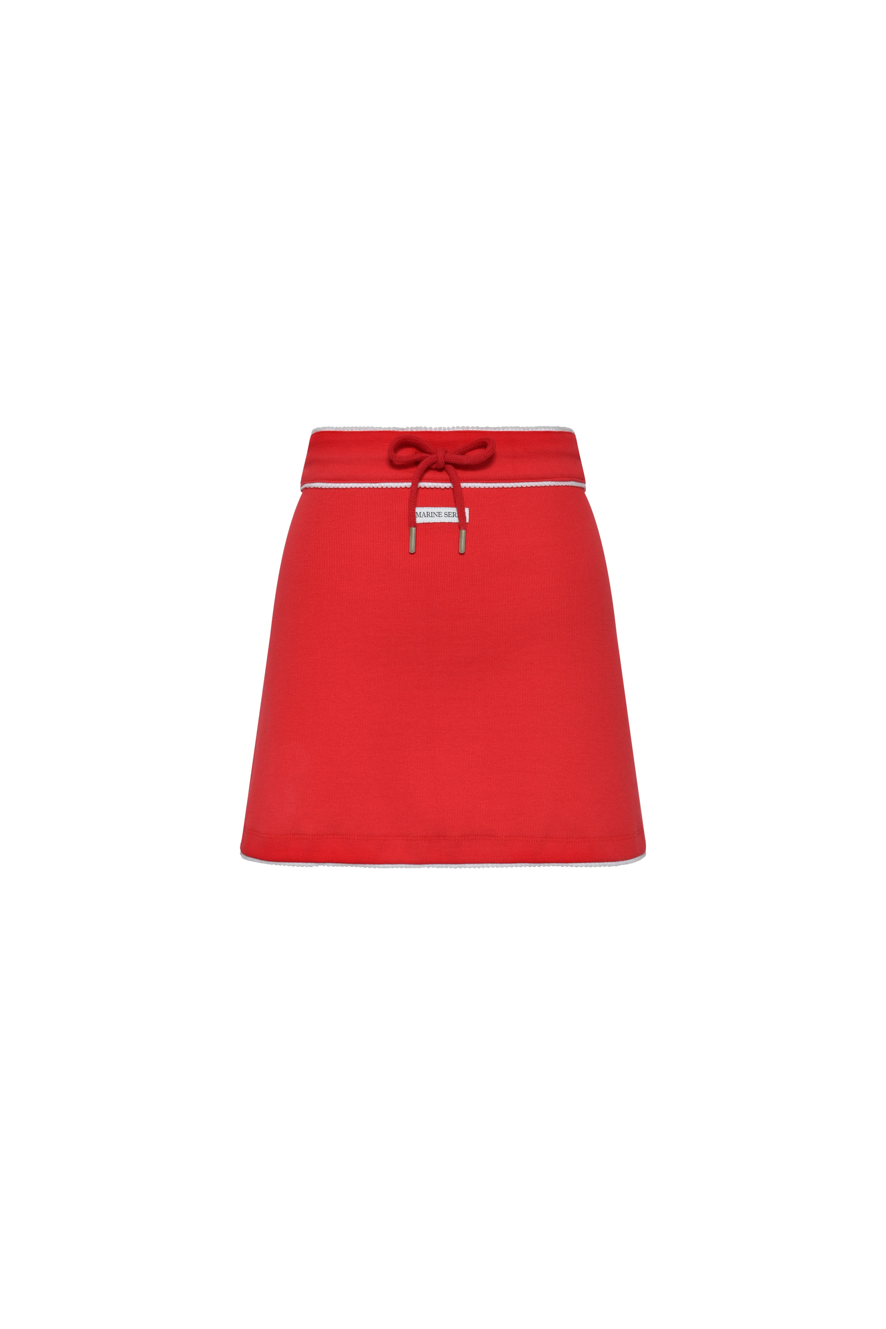 Fitted medium-waisted ribbed jersey mini skirt with drawstring waist Product Detail - Drawcords - Elasticated waistband - Woven logo label - Scalloped tape finishing at the waistband Composition and Traceability Product details page relating to environmental qualities or characteristics WSK133A CJER0011 RD10 RED Composition: - Main Fabric: 100% Cotton Issued from organic farming If organic and has a certification : GOTS Care Instructions: Machine wash at 30°C Do not bleach Low temperature iron on reverse side Dry clean with precaution Do not tumble dry Traceability: - Weaving/Knitting: Turkey - Dyeing: Turkey - Manufacturing: Turkey