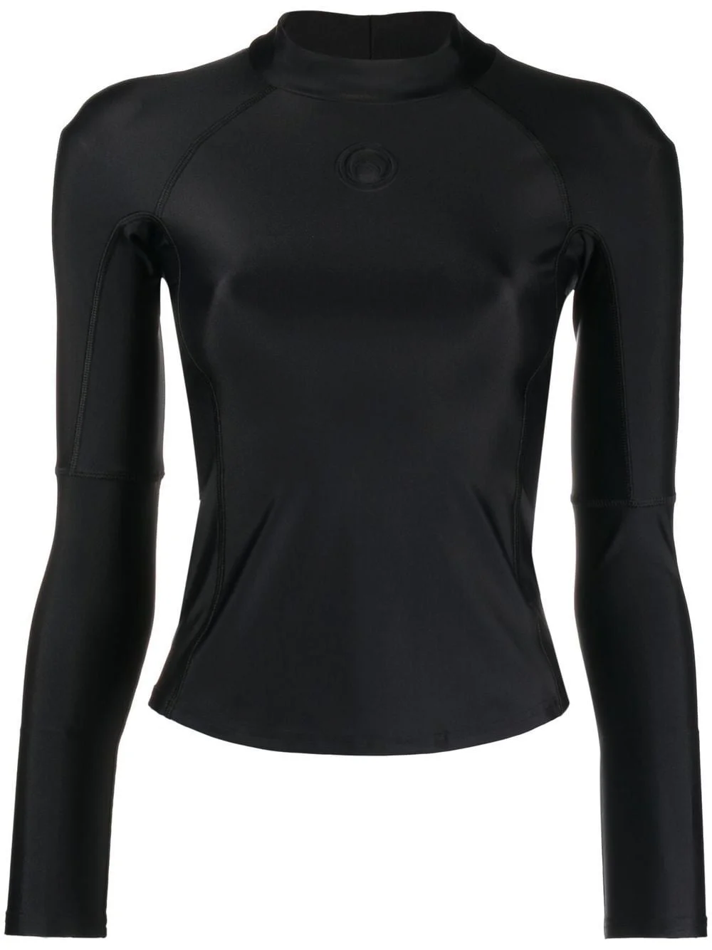 logo-embossed stretch top Combining a sporty aesthetic, an eco-conscious outlook and futuristic designs, Marine Serre presents pieces like this recycled stretch-nylon top. An embossed crescent moon details the chest for a signature finish. Highlights - Black - Recycled stretch-nylon - Embossed logo to the front - Logo stamp to the rear - High neck - Long raglan sleeves Imported Composition Recycled Polyamide 78%, Recycled Spandex 22% SIZE & FIT Model measurements Height 5 ft 11 in(1.8 m) Bust/Chest 31.49 in(80 cm) Hips 35.43 in(90 cm) Waist 25.19 in(64 cm) FittingInformation This piece fits true to size. We recommend you get your regular size Cut for a close fit Made with a mid-weight stretch fabric Washing instructions Machine Wash
