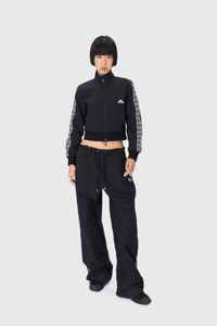 Unisex fitted cropped track jacket with high neck Product Detail - Double zipped front with signature Moon puller - Two welted side pockets - Knitted logo tape on side sleeves - Ribbed cuffs and hem - Mesh lining - MARINE SERRE SPORT logo embroidered on left chest Composition and Traceability Product details page relating to environmental qualities or characteristics UJA060A CWOV0041 BK99 BLACK Composition: Base Material: 74% Polyamide, 26% Cotton - Lining: 100% Polyamide Recycled material: 57% (Polyamide) Releases plastic microfibers into the environment when washing Traceability: Weaving/Dyeing: Korea Manufacturing: Italy