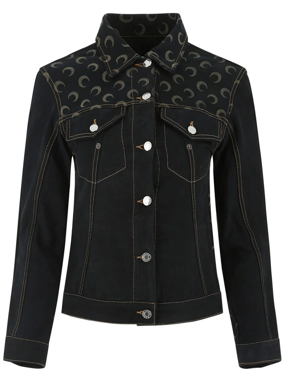 moon-print denim jacket Highlights - Black - Cotton - Denim - Front button fastening - Long sleeves - Crescent moon print - Two chest flap pockets - Curved hem - Logo patch to the rear Imported Composition Cotton 100%