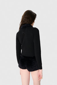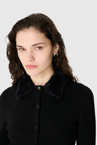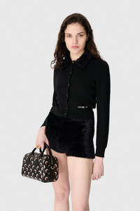 - Removable collar in fluffy knit - Front closure with 6 engraved buttons - Ribbed sleeves and bottom finishings - Uni color jacquard stitch - Hotfix moon logo patch - Marine Serre embroidery at bottom left Materials MERINO WOOL KNIT 100% WOOL
