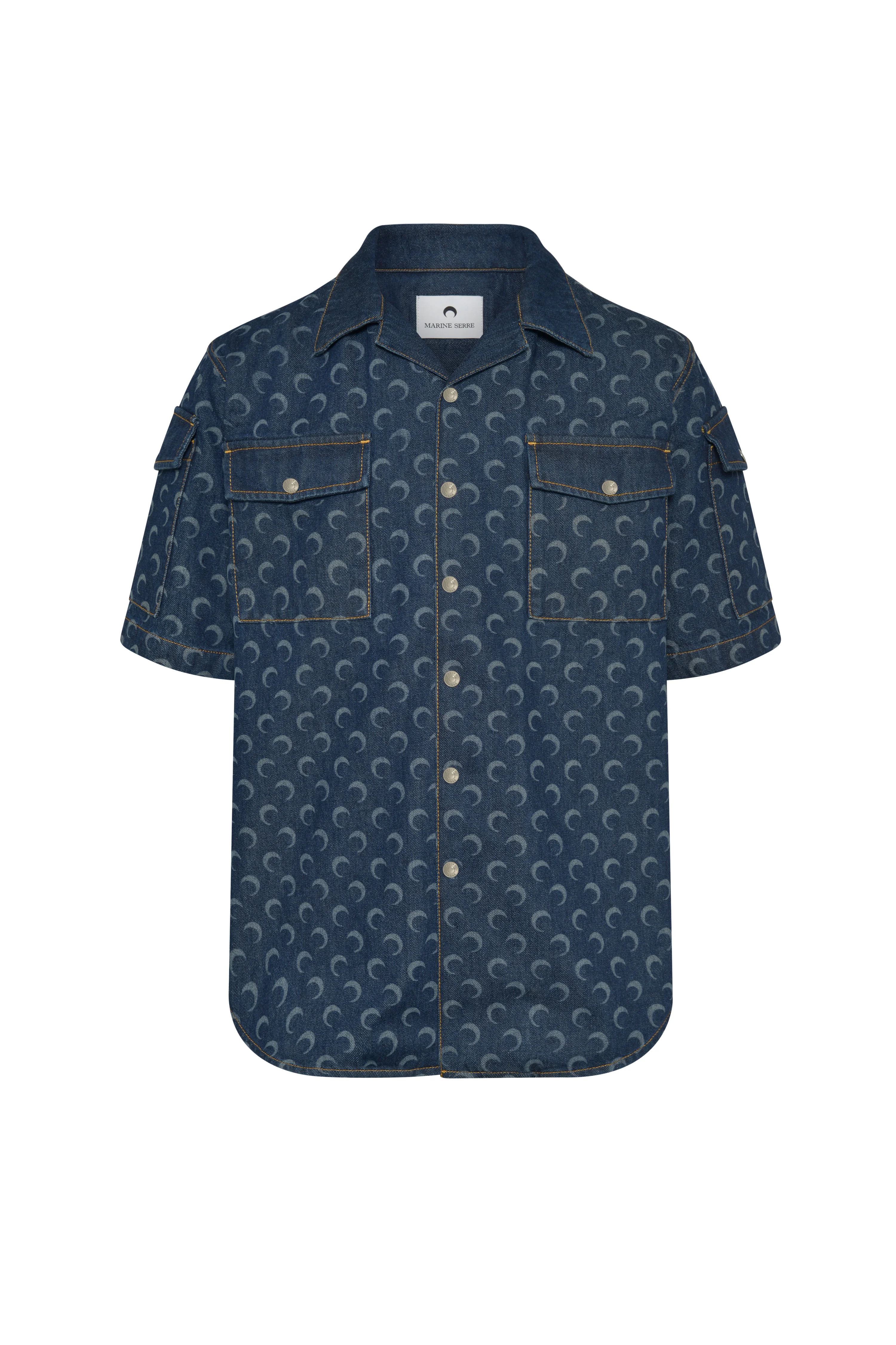 Loose fit short sleeve denim shirt with a bowling collar Product Detail - Bowling collar - Snap buttoned front - Flap chest pocket with visible snap - Set-in sleeve with flap pocket with visible snap - Marine Serre leather patch - Triangle back yoke Composition and Traceability Product details page relating to environmental qualities or characteristics MSI062A RDEN0002 BL80 MIDNIGHT BLUE Composition: - Main Fabric: 100% Cotton Care Instructions: Machine wash at 30°C with precaution and without spinning Do not bleach Low temperature iron on reverse side Dry clean with precaution Do not tumble dry Traceability: - Weaving/Knitting: Turkey - Dyeing: Turkey - Manufacturing: Turkey