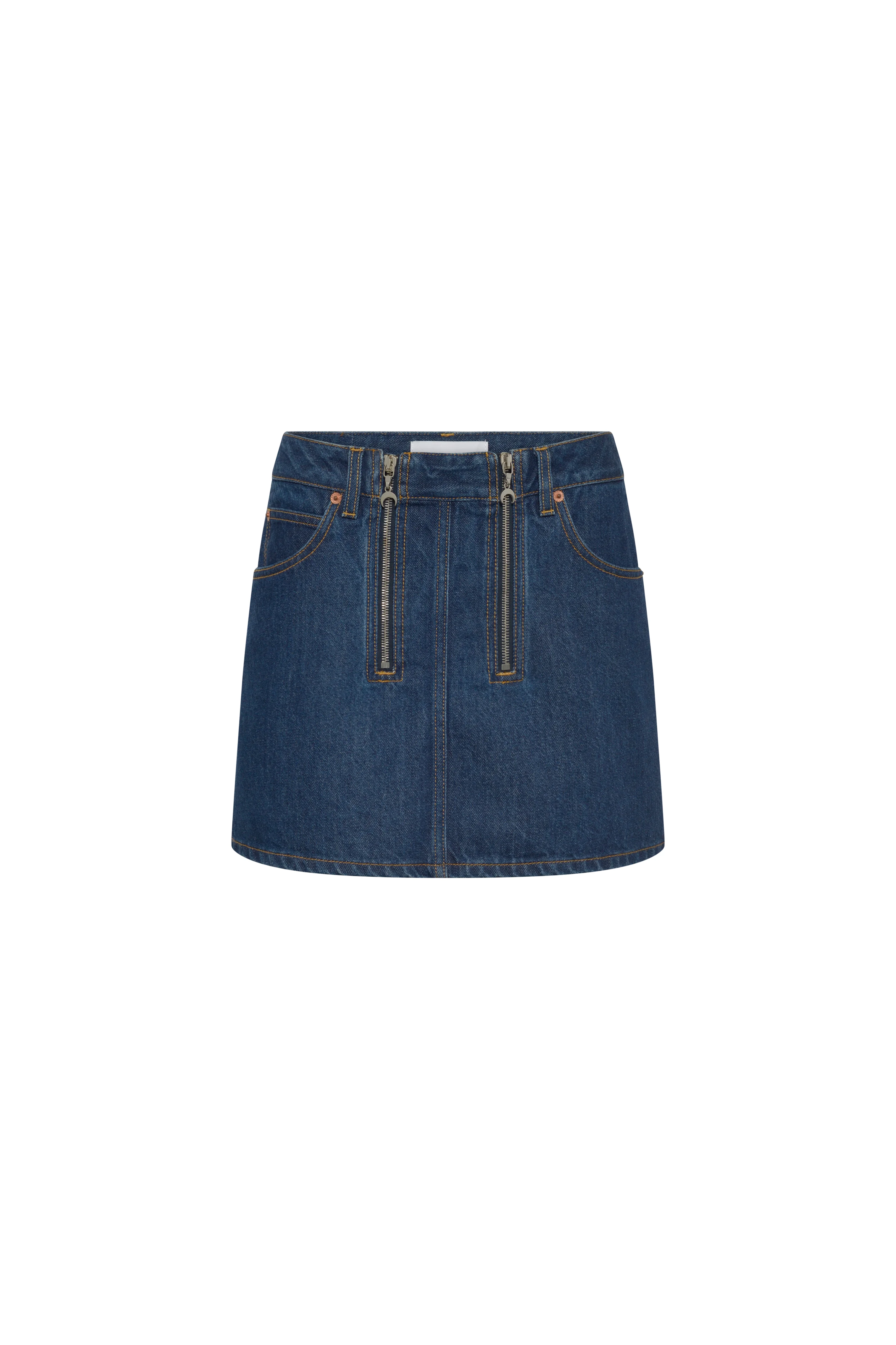 Fitted medium-waisted mini skirt with zip Product Detail - Double zipper on front - Front pockets - Belt loops - Cotton twill pocket bag - Marine Serre leather patch Composition and Traceability Product details page relating to environmental qualities or characteristics WSK135A RDEN0002 BL80 MIDNIGHT BLUE Composition: - Base Material: 100% Cotton Care Instructions: Machine wash at 30°C Low temperature iron on reverse side Do not bleach Dry clean with precaution Do not tumble dry Traceability: - Weaving/Knitting: Turkey - Dyeing: Turkey - Manufacturing: Turkey