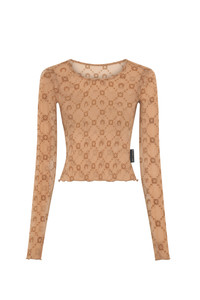 Second skin cropped top with an open neck and long sleeves Product Detail - Signature Moonogram flocked all over - Reinforced neckline - Babylock cuffs and hem - Branded label woven on left side seam Composition and Traceability Product details page relating to environmental qualities or characteristics WTS012A CJER0005 BG60 CAMEL Composition: 86% Polyamide, 14% Elastane Recycled material: 86% (Polyamide) Releases plastic microfibers into the environment when washing Traceability: Weaving/Dyeing: Italy Manufacturing: France