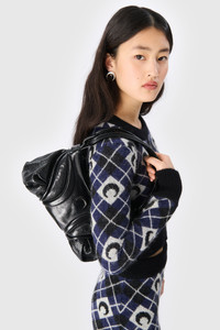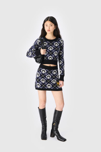 - Double layered ribbed neckline - Ribbed cuffs and hem - Branded label below neck in back Materials Moon Argyle Knit Black Argyle and lozenge knits have been an essential part of our knitwear collections for a long time, with the moon lozenge and Harlequeen knits being ever present. This season, a brand new print has been devised and applied on a mohair blend yarn. 65% Wool Merinos, 32% Polyamides, 3% Wool Merinos