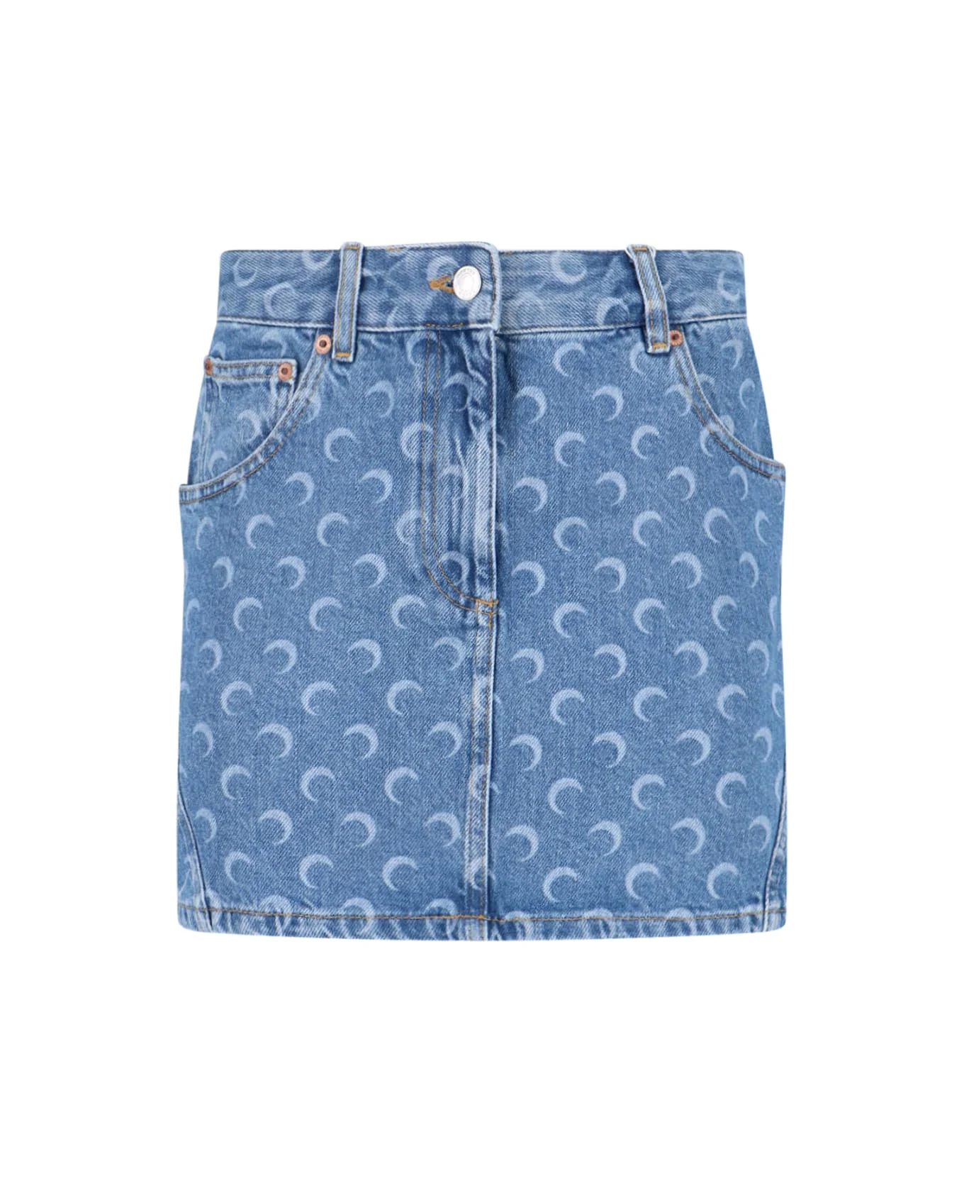 Marine Serre 'Moon' denim miniskirt in light blue cotton with laser logo print pattern "Moon", mid waist, button and zip closure, belt loops, two front and back pockets, leather logo patch at the back, straight hem. Composition: 100% Cotton Made in: Italy Color: Light Blue Size and fit: - Vestibilita regolare Model number: WSK057BCDEN0002BL05