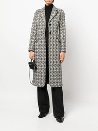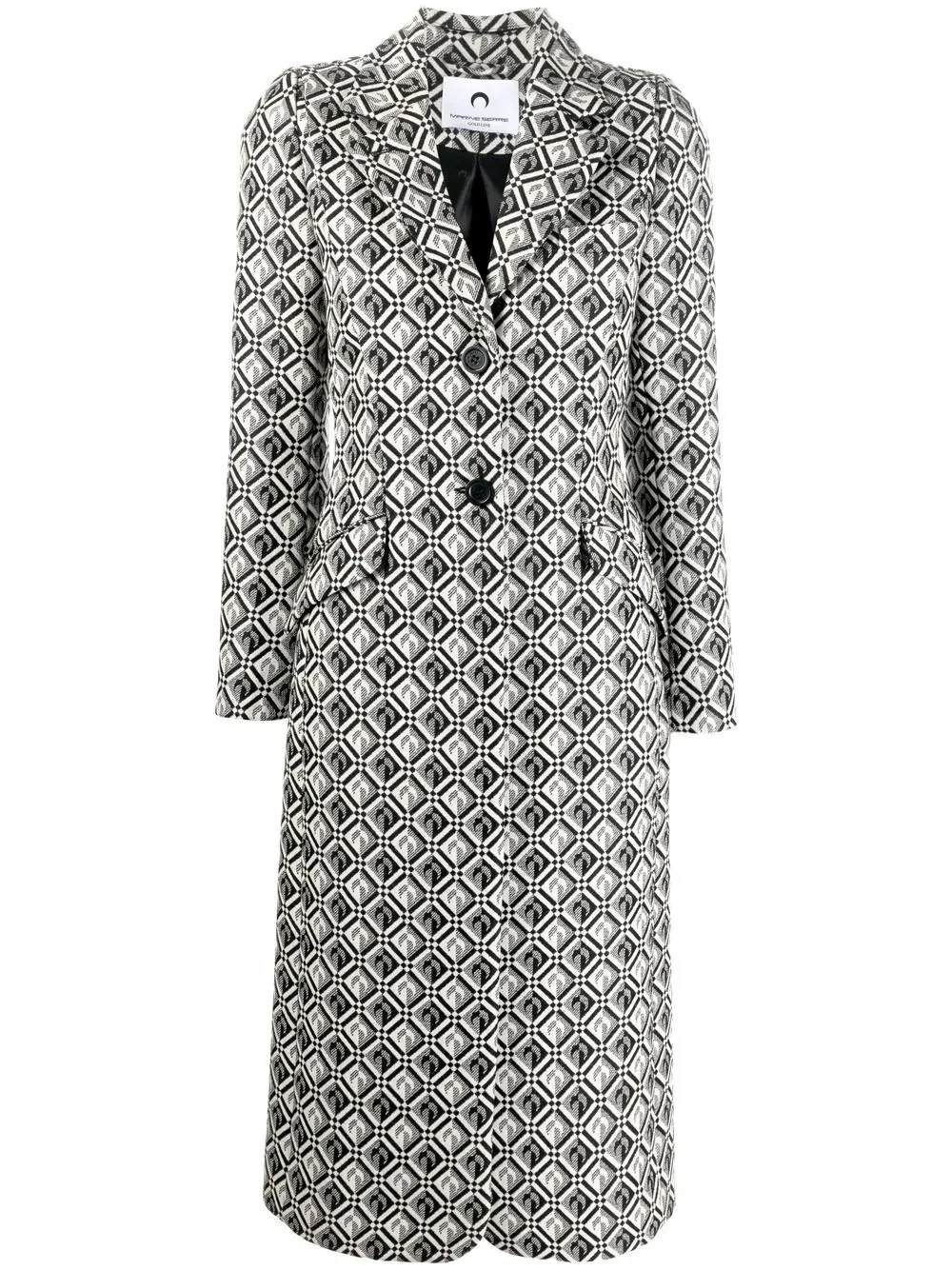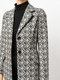 Moon Diamant tailored coat Made in France from a blend of virgin wool and recycled polyester, this coat from Marine Serre's AW22 collection is cut for a tailored fit and adorned with the brand's Diamant motif. In a black and white colourway, this piece is complete with notched lapels and channels the label's craftsmanship and innovative approach to garments. Highlights - Moon diamant tailored coat from marine serre featuring black, white, virgin wool, tailored cut, front button fastening, notched lapels, two side flap pockets, long sleeves, buttoned cuffs and diamant pattern. . Made in France Composition Virgin Wool 65%, Recycled Polyester 35% SIZE & FIT Model measurements Height 5 ft 11 in(1.8 m) Bust/Chest 31.49 in(80 cm) Hips 35.43 in(90 cm) Waist 24.4 in(62 cm) FittingInformation This piece fits true to size. We recommend you get your regular size Cut for a slim fit Made with a mid-weight fabric Washing instructions Dry Clean Only