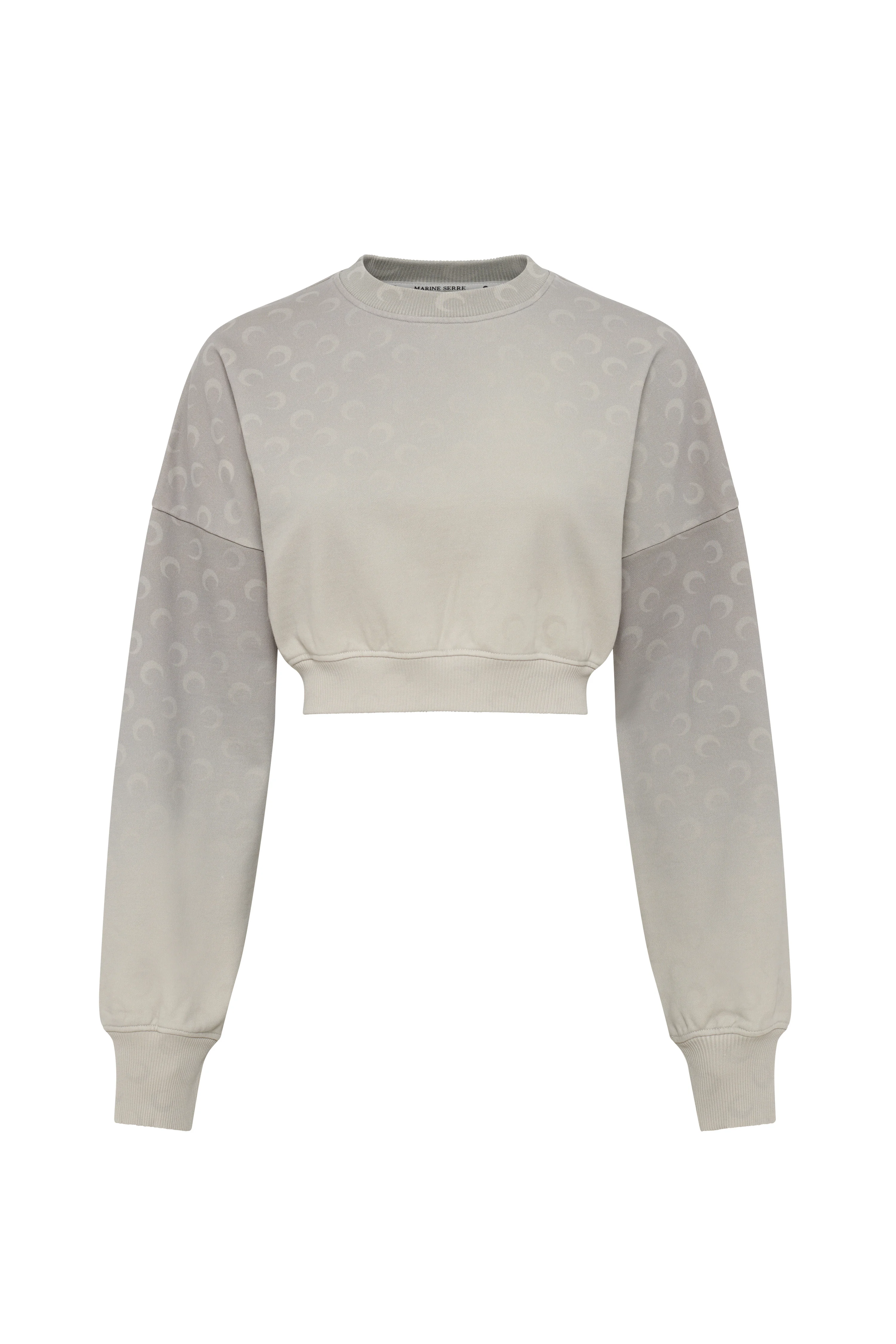 - FADED MOON artwork printed all over - Ribbed neckline, cuffs, and hem - Extra long sleeves with thumbhole - Branded label woven under neck in back Materials Moon Faded Fleece All the cotton Marine Serre sources for Borderline is GOTS-certified — this world-leading textile processing standard chiming with the house’s own well-known commitment to protecting the planet. In terms of the silhouettes across these ranges, we wanted to offer a wide range of everyday styles that are directly inspired by the world of sportswear. Our Moon Logo Jersey lines come in a range of traditional colours (white, black and grey, but in most cases lilac too) spun out across t-shirts, tanks and dresses, as well as underwear. These garments are finished in the classic way familiar from sportwear garments, with our Moon Logo in raised embroidery just below the neckline. Some of the Recycled Cotton Jerseys (lilac and grey) feature our MS Sport logo — a print moon with Marine Serre embroidered above, and we have also expanded our palette with seasonal colours such as red and blue, bearing a Gradient All Over Moon print. 100% COTTON