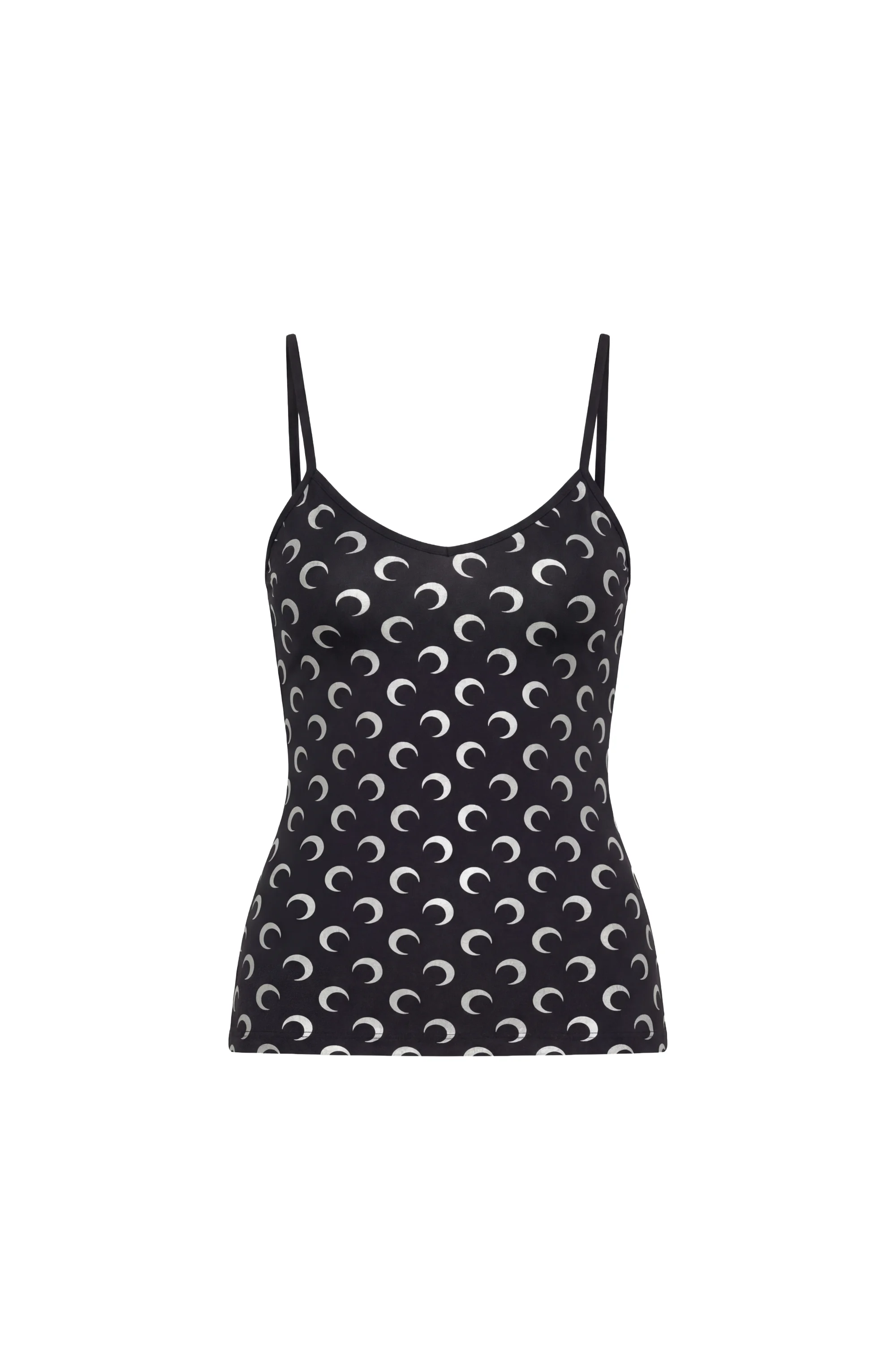 Fitted strap top with spaghetti shoulder straps Product Detail - All-over signature moon print - Soft, stretchy jersey fabric - Sraps for a perfect fit Composition and Traceability Page detaillee du produit relative aux qualites ou caracteristiques environnementales WTO508A_CJER0111_BK94_BLACK/SILVER Composition : 84 % polyamide, 16 % elasthanne Entretien du produit : lavage en machine a 30 °C Tracabilite : Tissage/teinture/fabrication : Portugal