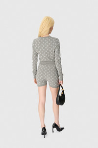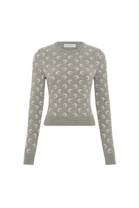 Fitted short length sweater with crewneck and long sleeves Product Detail - Ribbed neckline - Ribbed sleeves and bottom finishings - Jacquard stitch with all over moon signature artwork - Jacquard moon logo Composition and Traceability Product details page relating to environmental qualities or characteristics WTK014B_CKNI0530_GR60_MISTY_GREY Composition: 50% Virgin Wool , 50% Viscose Product Care: Gentle hand wash Do not bleach Do not iron Dry clean with precaution Do not tumble dry Traceability: Weaving, Dyeing, Manufacturing: Italy