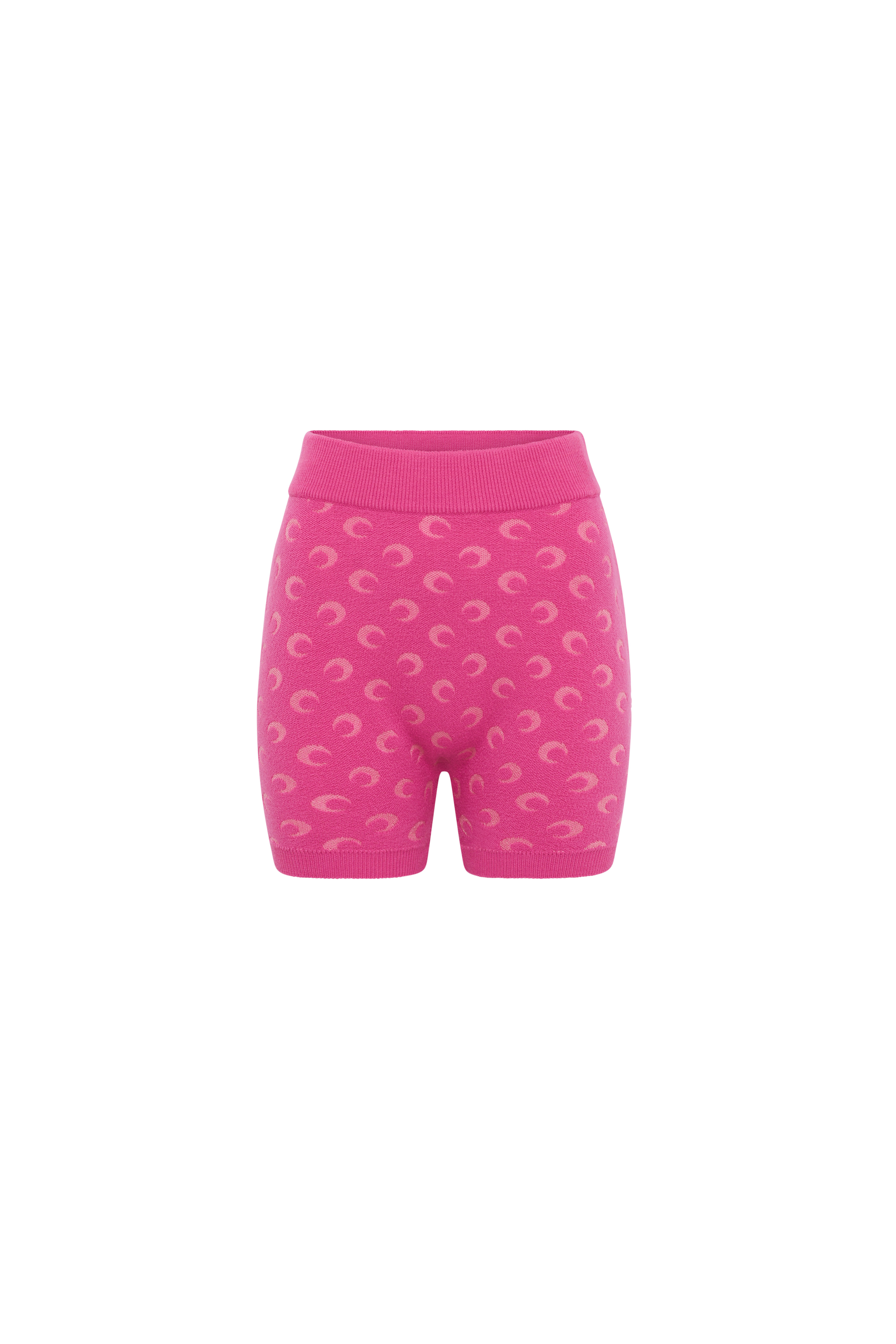 Fitted high-waisted mini shorts Product Detail - Ribbed legs finishings - Ribbed elasticated waistband - Jacquard stitch with all over moon signature artwork - Jacquard moon logo Composition and Traceability Product details page relating to environmental qualities or characteristics WSH013A_CKNI0530_PK30_PINK Composition: 50% Virgin Wool , 50% Viscose Product Care: Gentle hand wash Do not bleach Do not iron Dry clean with precaution Do not tumble dry Traceability: Weaving, Dyeing, Manufacturing: Italy