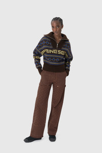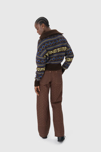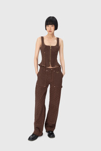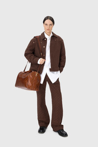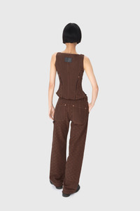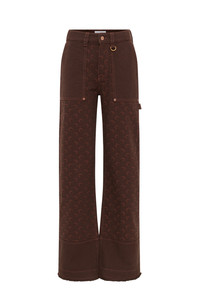 - Four square pockets - Zipped front with a shank button - Adjustable waist straps - Belt loops - D-ring on front left belt loop - Hammer loop on side - Signature Moon jacquard twill all over - Branded leather patch on back waistband - Logo engraved on button Materials Moon Jacquard Twill This GOTS-certified organic cotton twill is woven in Italy and embellished using a jacquard technique to create the raised crescent-shaped motifs that characterise the All Over Moon print. Introduced last season in a beige colour, the Moon Jacquard Twill returns for another outing in the new shade of tone-on-tone brown, happily not straying too far from the harmonious and organic palette of its predecessor. This fabric is the foundation for Marine Serre to spin out her modern-day vision of workwear: practical and everyday pieces, as per tradition, but made in an eco-responsible material, and featuring a refined and elegant design. As always, it’s the level of attention to detail here that takes something humble and makes it high-end — namely raw hems, topstitching and a variation in the saturation levels of the All Over Moon print across the garments. Pieces are finished on the back or side with a black leather Marine Serre jacron. 100% Cotton