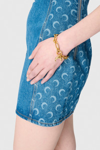 - Zipper on the side - Gold buckle straps - Signature moon laser-printed all over on side panels - Marine Serre leather patch Materials Moon Laser Denim Blue Marine Serre offers a 100% GOTS Certified Organic denim twill family of garments, in addition to a Regenerated one. For this new family of denims, Marine Serre has opted for a light washed classic indigo as well as a striking black variant. 100% Cotton (GOTS Certified)