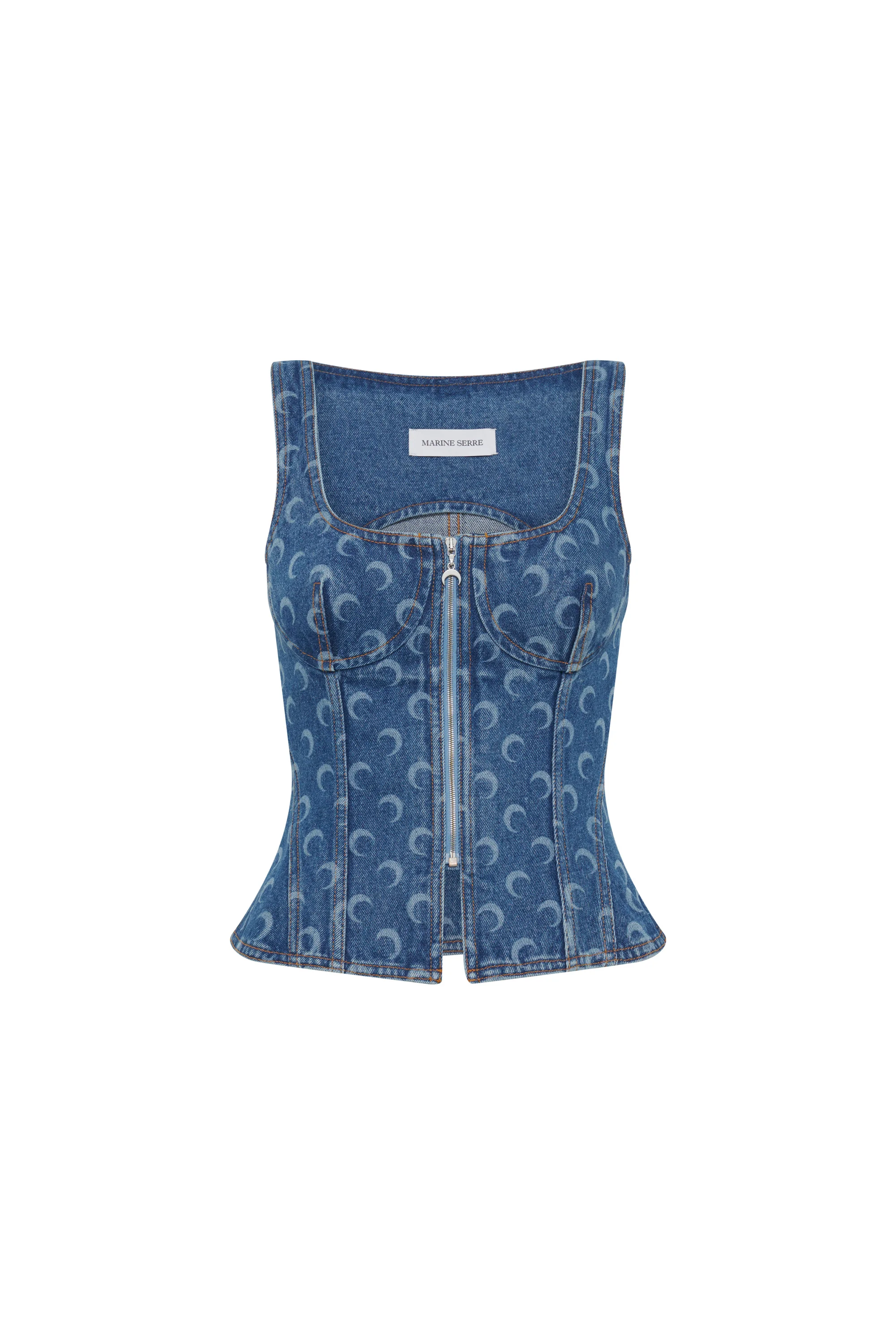 - Zipped front with signature Moon puller - Princess seams contour the bustier - Corset-like structure enhances the silhouette - Jersey inserts in back seams allow extra fittedness - Darted back - Branded jacron woven under neck in back - Signature Moon laser printed all over on front and side yokes Materials Moon Laser Denim Blue Marine Serre offers a 100% GOTS Certified Organic denim twill family of garments, in addition to a Regenerated one. For this new family of denims, Marine Serre has opted for a light washed classic indigo as well as a striking black variant. 100% Cotton (GOTS Certified)