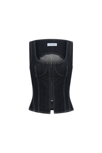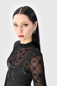 - Zipper closure in front - Sleeveless - Panelled construction - Jersey insert in back seams - Moon allover laser printed denim on front and back panel - Darted back - Jacron with logo on below neck in back - Logo engraved on button Materials Black Denim Laser-engraved with the iconic crescent moon print on some panels, this cornerstone material of the house is dyed in piercing black for carryover staples. Matter: Denim Trousers 100% Cotton, ca. 1960, sourced in France & UK